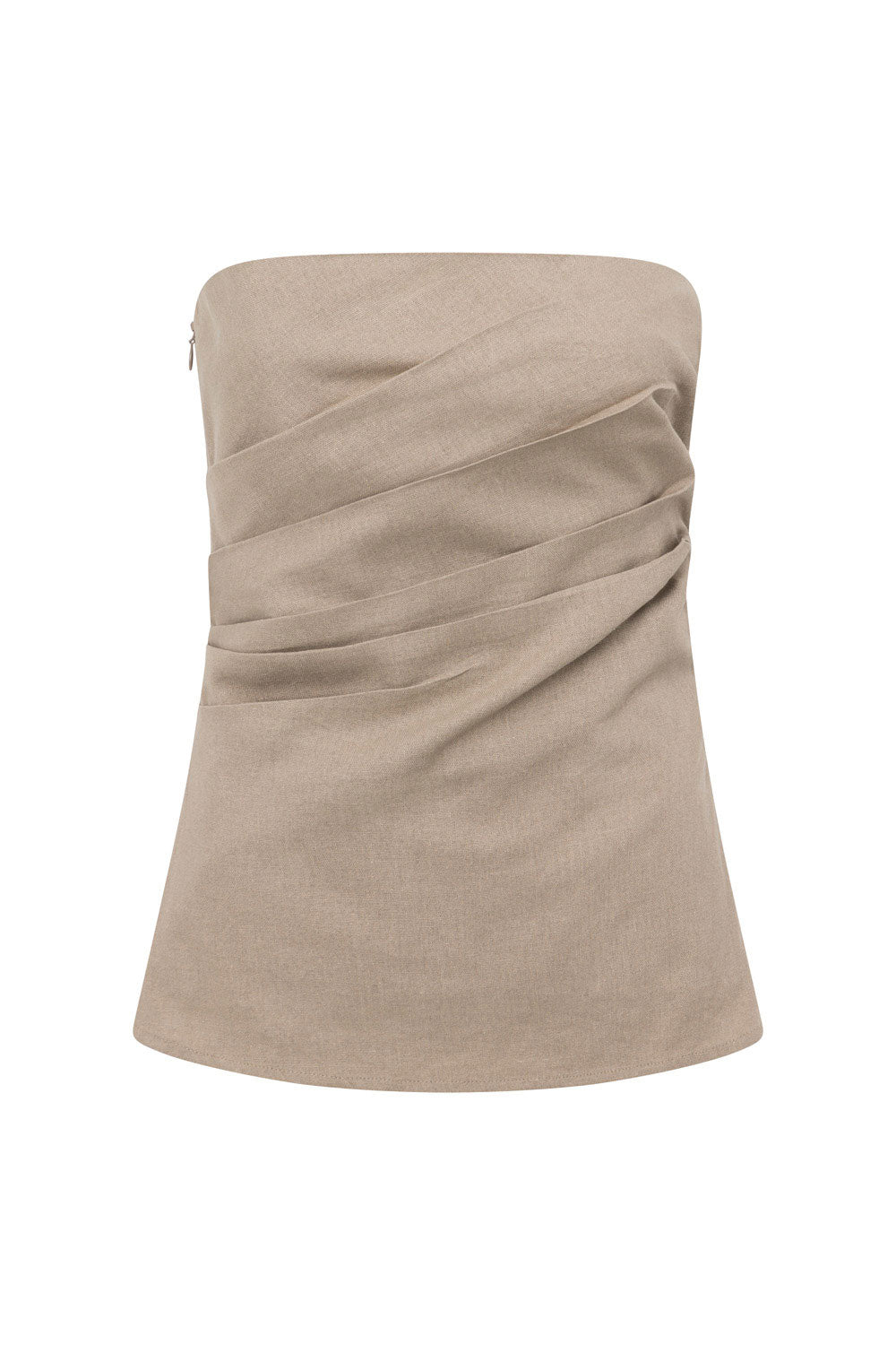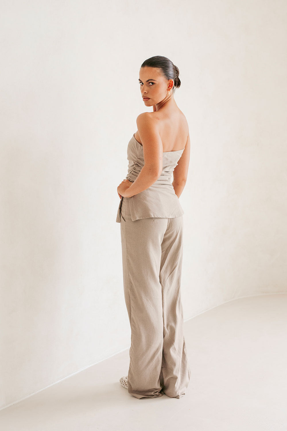 A stylish set for our fashion forward girls! The Aimee Top is made from a structured natural linen cotton blend fabric in a stone hue. Featuring a strapless neckline, it boasts gathered details at waist and a longline a-line hem. Get the set and pair with the Aimee Pants and Topaz Heels! Designed exclusively by Sabo.