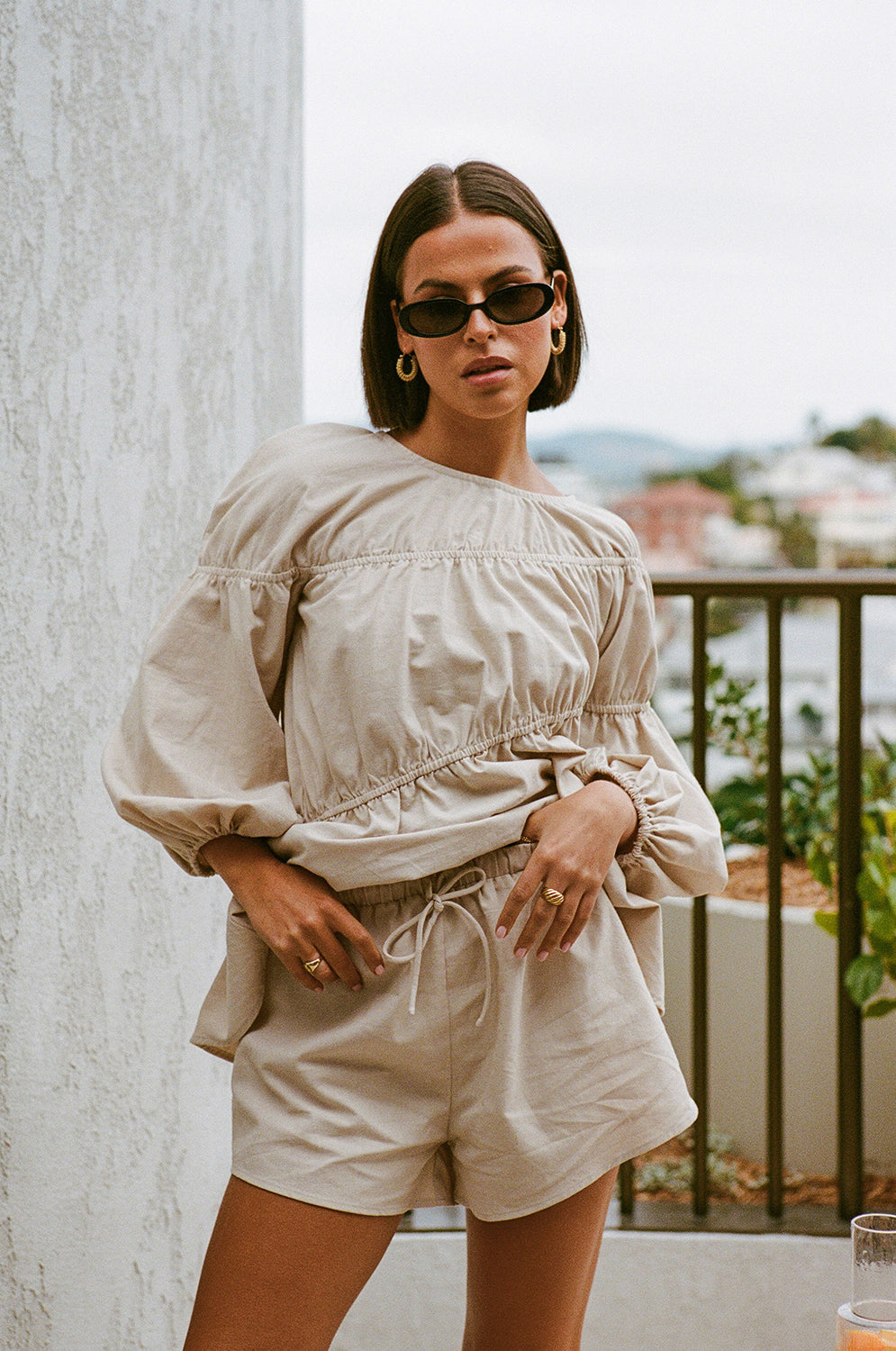 A Sabo signature set with a twist! The Akel Shorts are made from a structured natural linen cotton blend fabric in a creamy beige hue. They are a high waisted style featuring an elasticated waist with drawstring detail. Get the set with the Akel Top and add the Cloud Claw Clip! Designed exclusively by Sabo.