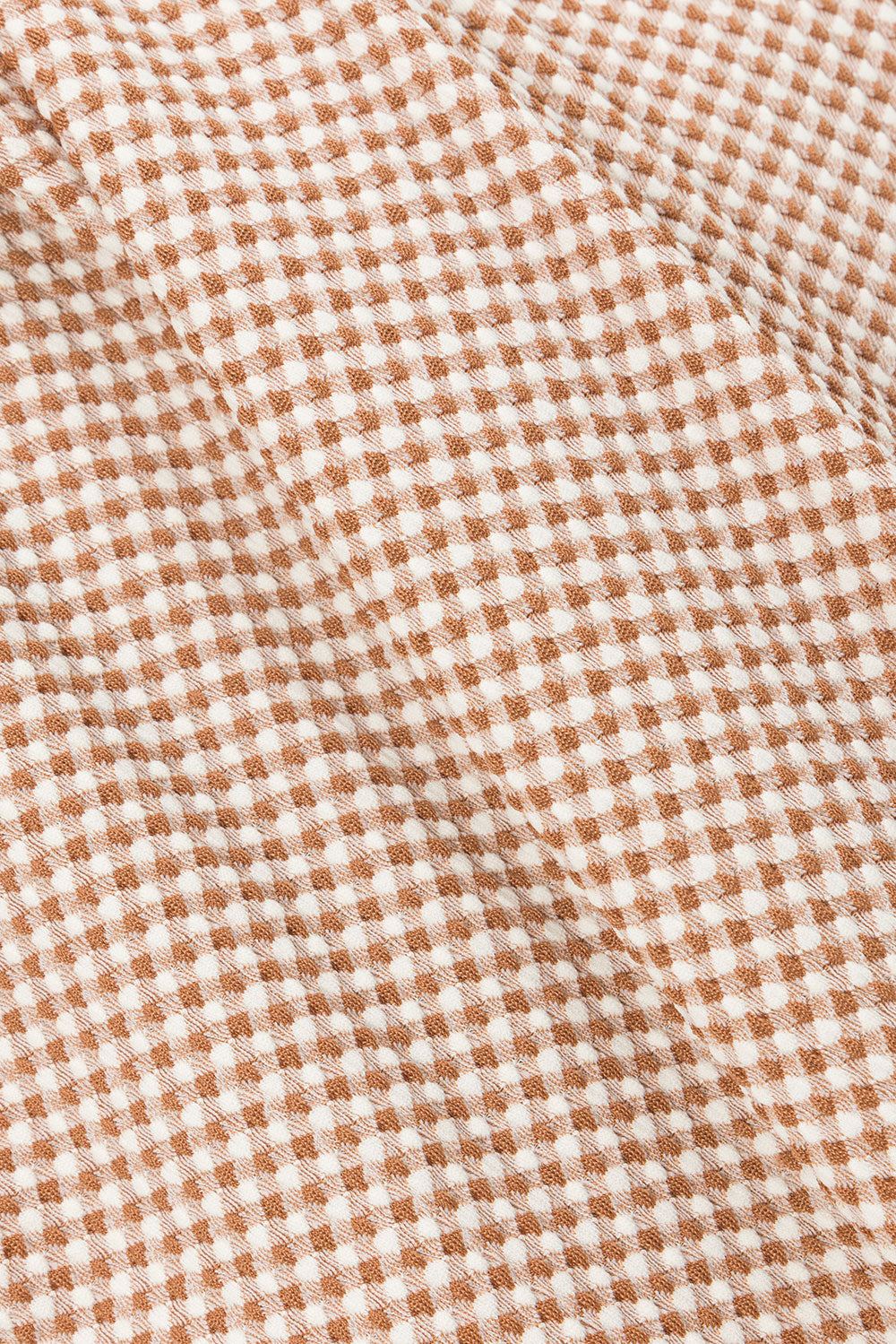 Designed to flatter, the Alba Jumpsuit is made from a textured gingham fabric in tan and white hues. It features thin adjustable straps, relaxed longline overlay top with cutout and slung back neckline and wide leg pants. Dress it up with the Zita Strappy Heels! Designed exclusively by Sabo.