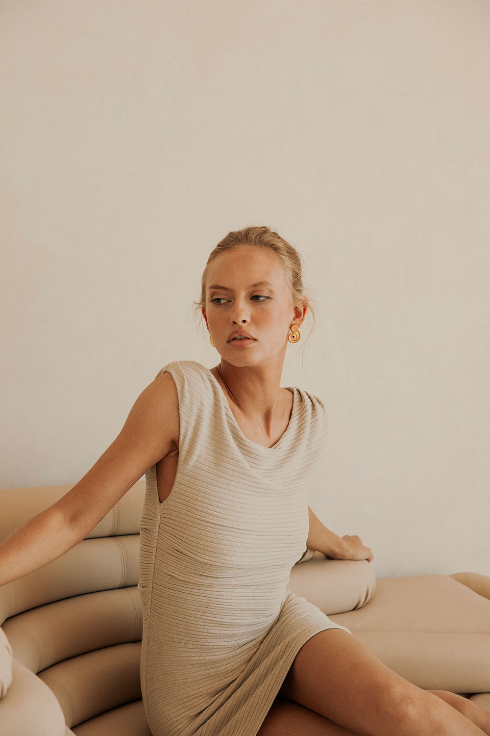 A super cute party dress! The Allegra Dress is made from a flattering ribbed fabric in a creamy taupe hue. It features an asymmetric boat neckline, gathered details at shoulders and waist and a flouncy mini skirt. Dress it up with the Bobbi Heels for your next night out! Designed exclusively by Sabo.