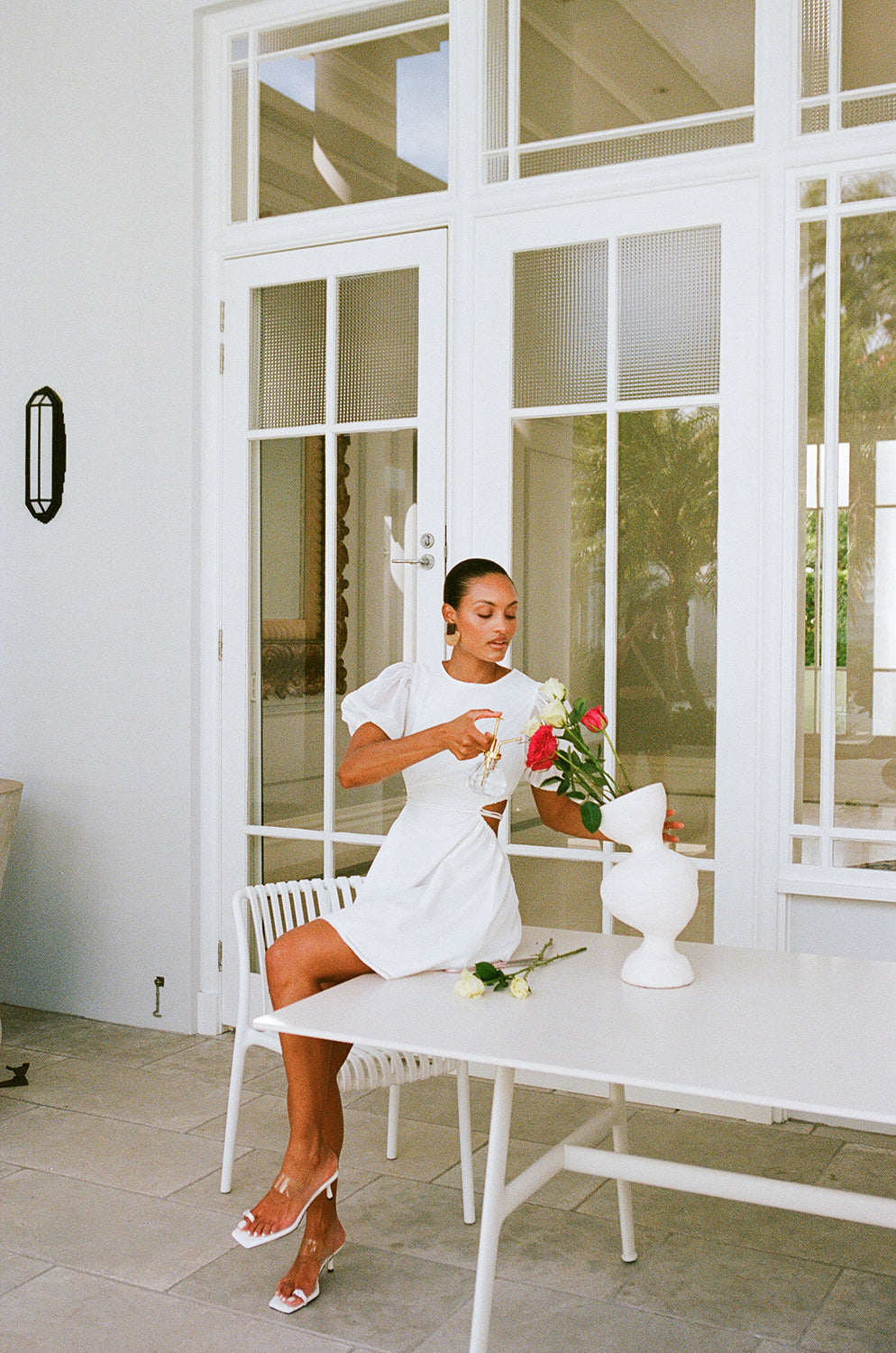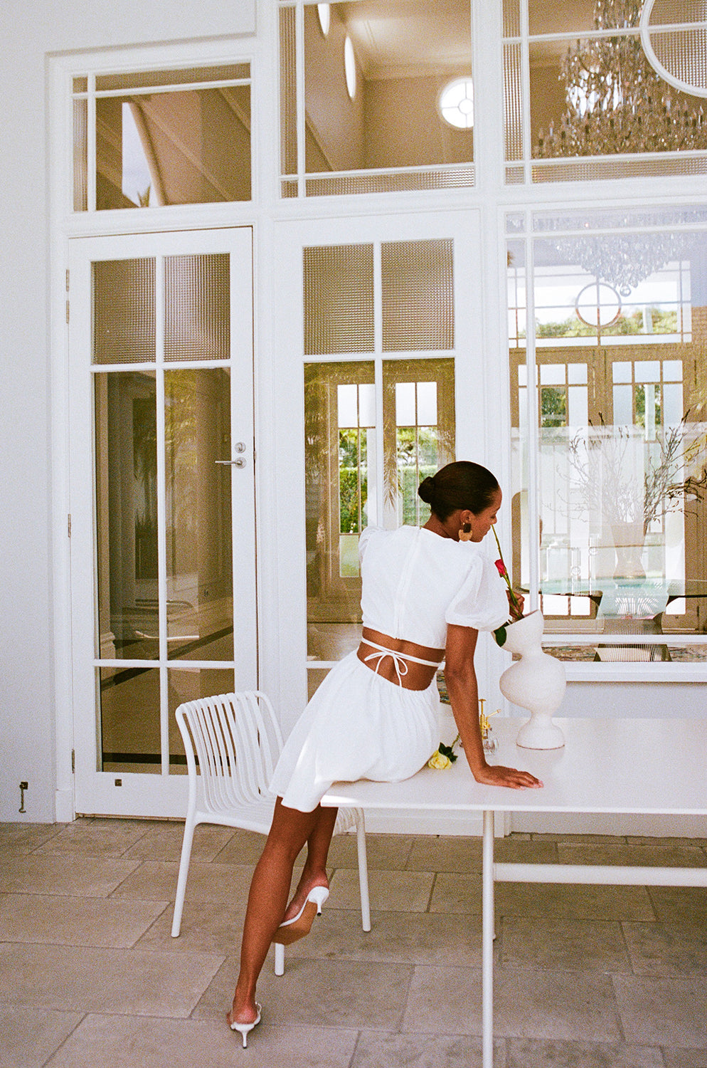 An ultra feminine style with a flattering silhouette! The Anabelle Cutout Dress is made from a knit mesh fabric in white. It features unlined sheer short puff sleeves, high rounded neckline, cutouts at waist with wrap tie at waist and a full, flouncy mini skirt. Dress it up with the Rosaria Heels for your next event! Designed exclusively by Sabo.