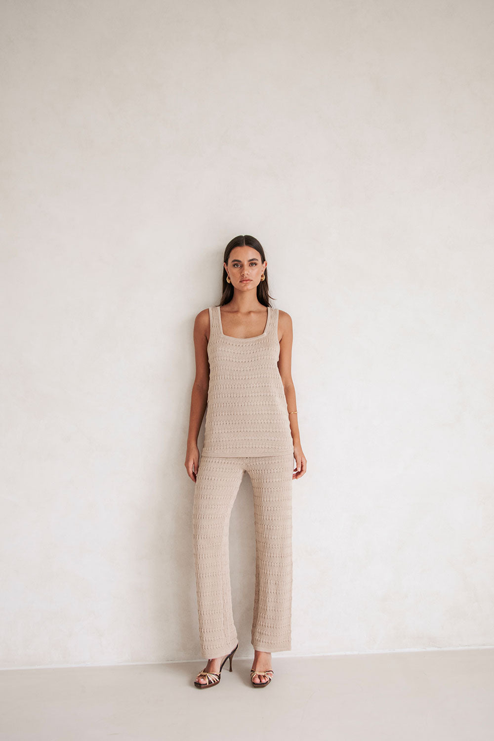 Wear them as a set or style them your way! The Ari Pants are made from a light knitted fabric with textured self bubble stripes in a tan hue. They are a high waisted style featuring an elasticated waist and wide leg pants. Get the set with the Ari Top! Designed exclusively by Sabo.