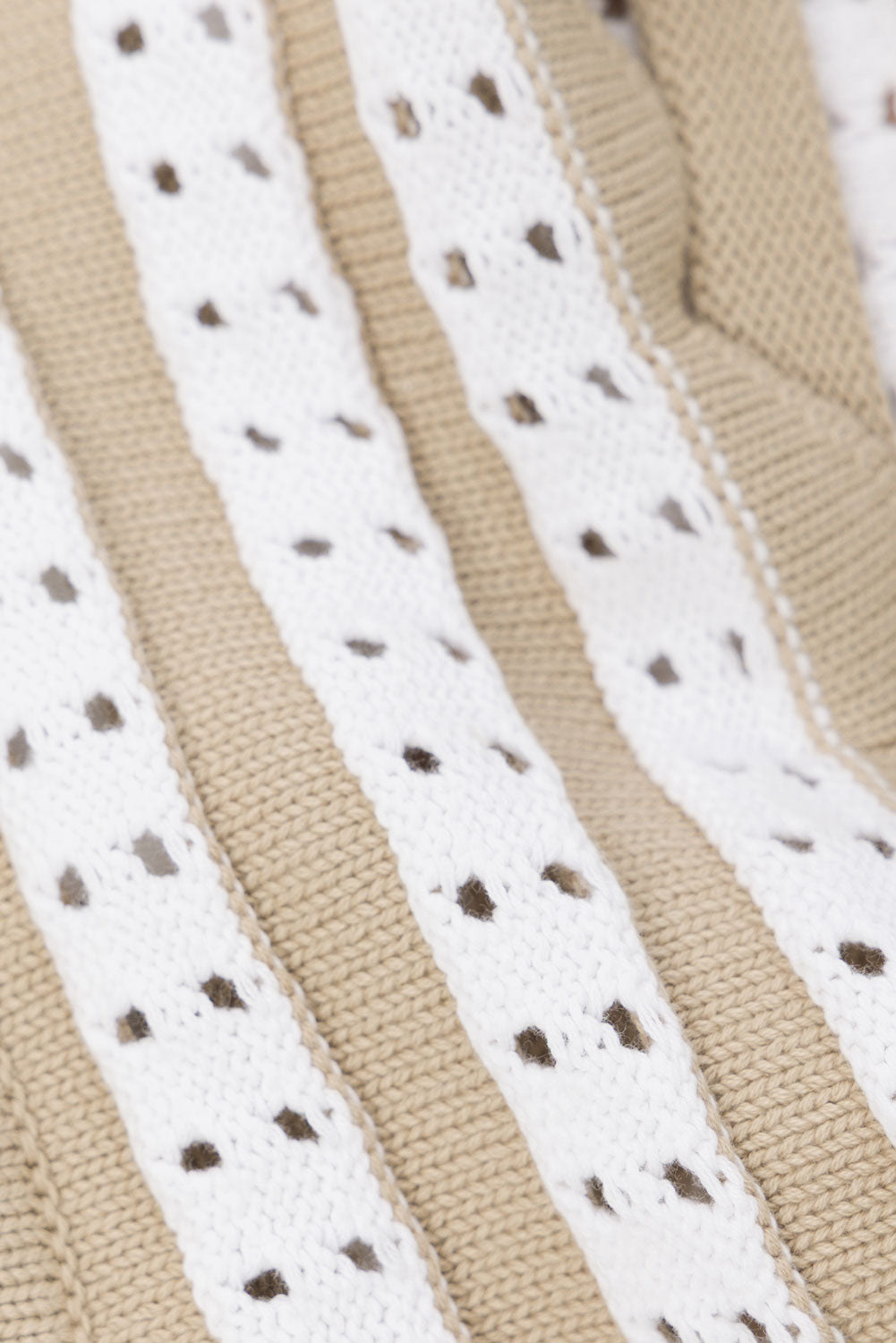 Wear it as a set or style it with shorts for a super cute vacation look! The Aston Top is made from a high quality cotton knit and features adjustable straps, contrast tan and white openwork crochet and solid knit stripes, scalloped trims and a cropped hem. Get the set with the Aston Skirt. Designed exclusively by Sabo.