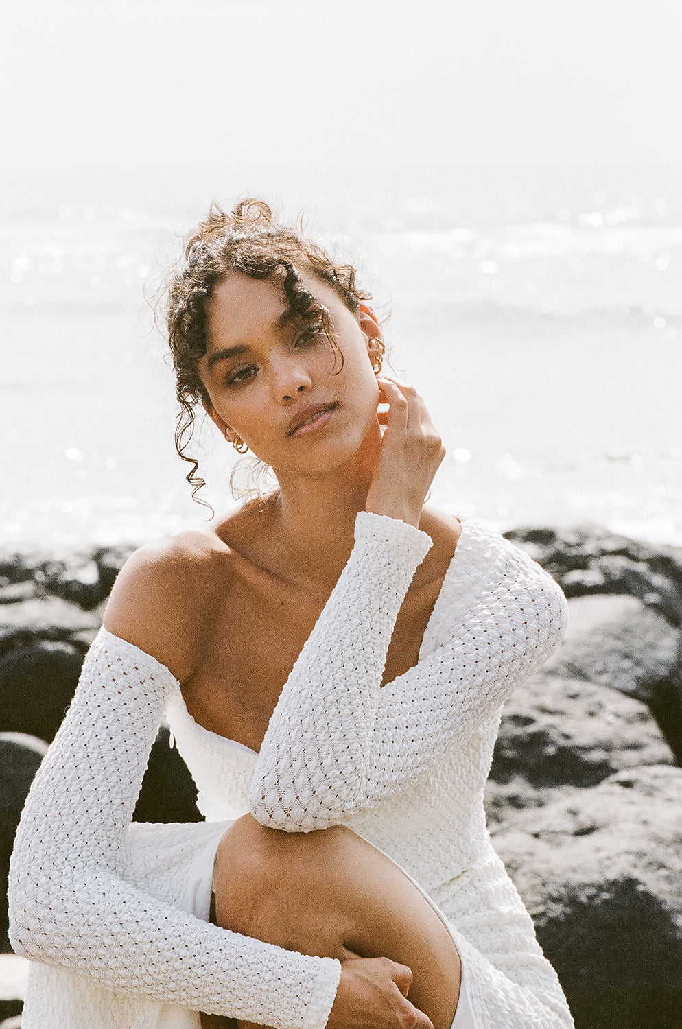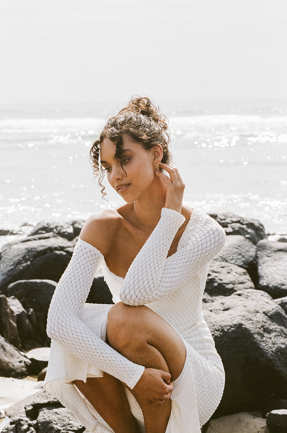 Introducing our Drift collection with the Astrid Dress; a classy design perfect for a bridal event! It is made from a stunning textured bubble fabric in white. It is a fitted style featuring an asymmetric neckline, full length sleeves and a midi length skirt with side split. Style your look with the Strappy Paz Heels! Designed exclusively by Sabo.