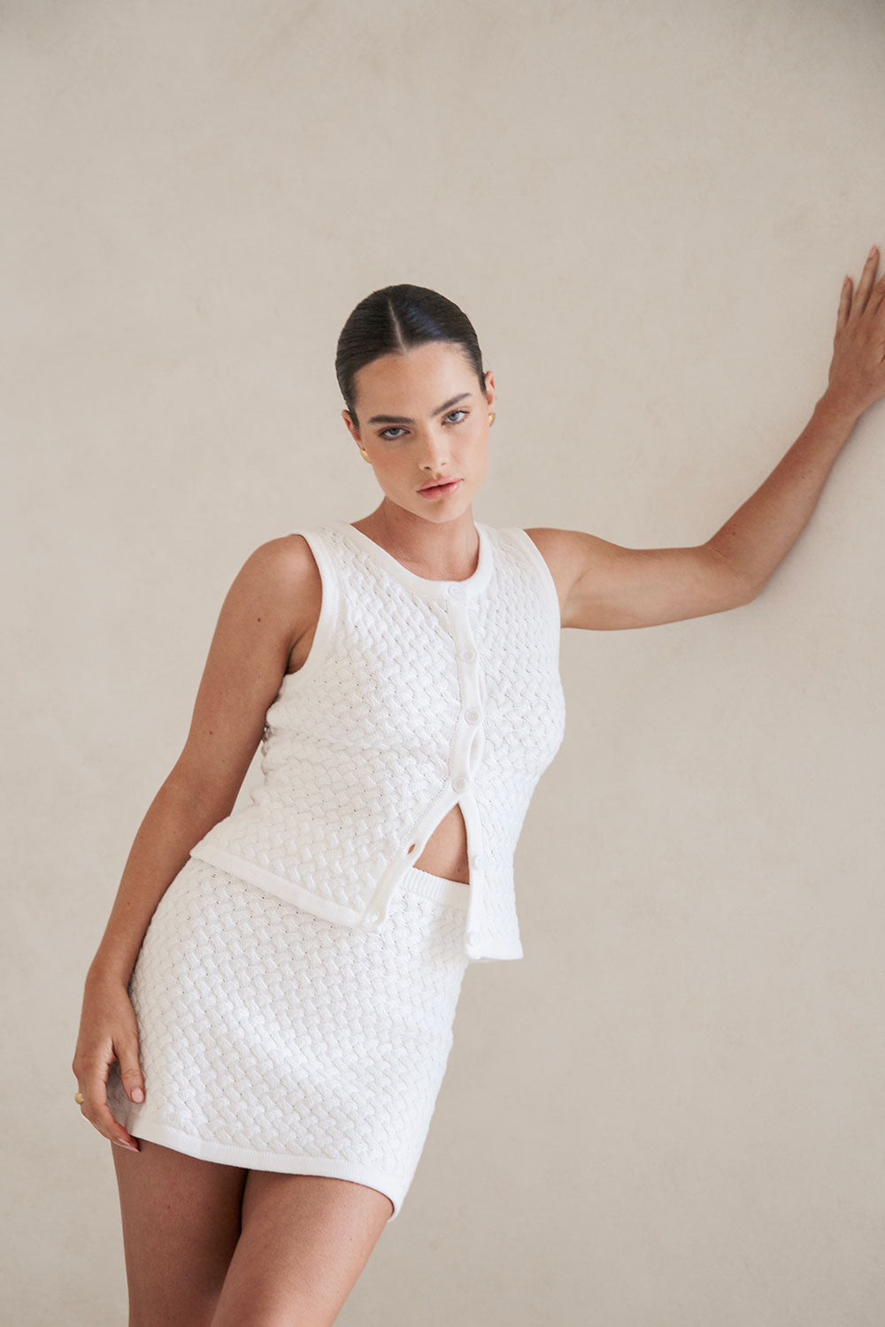 The vintage inspired Avalon Top is made from a natural cotton basket knit fabric in an off white hue. It is a fitted style featuring buttons at centre front and ribbed trims. Wear it as a set with the Avalon Skirt and high boots or style it back with jeans! Designed exclusively by Sabo.