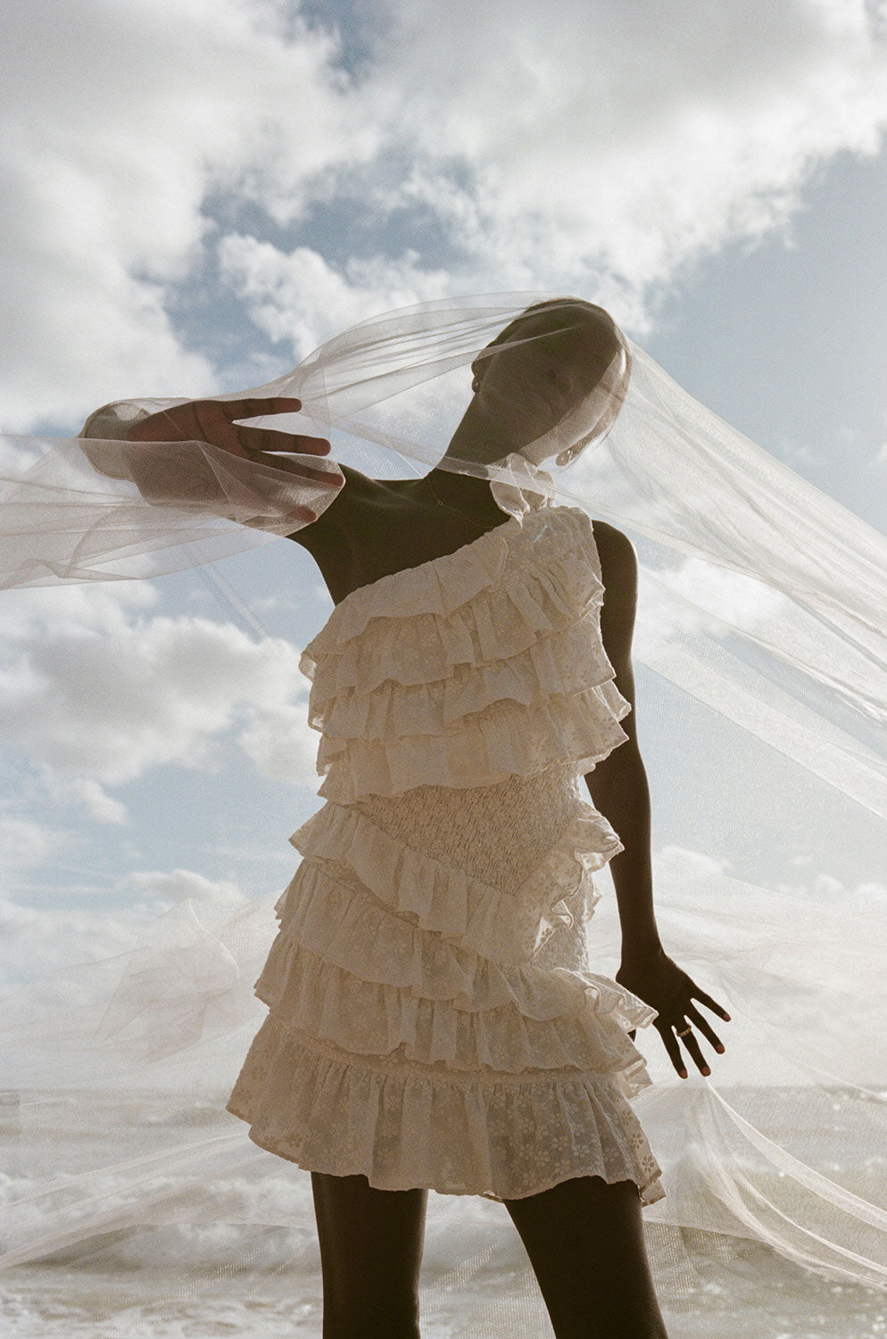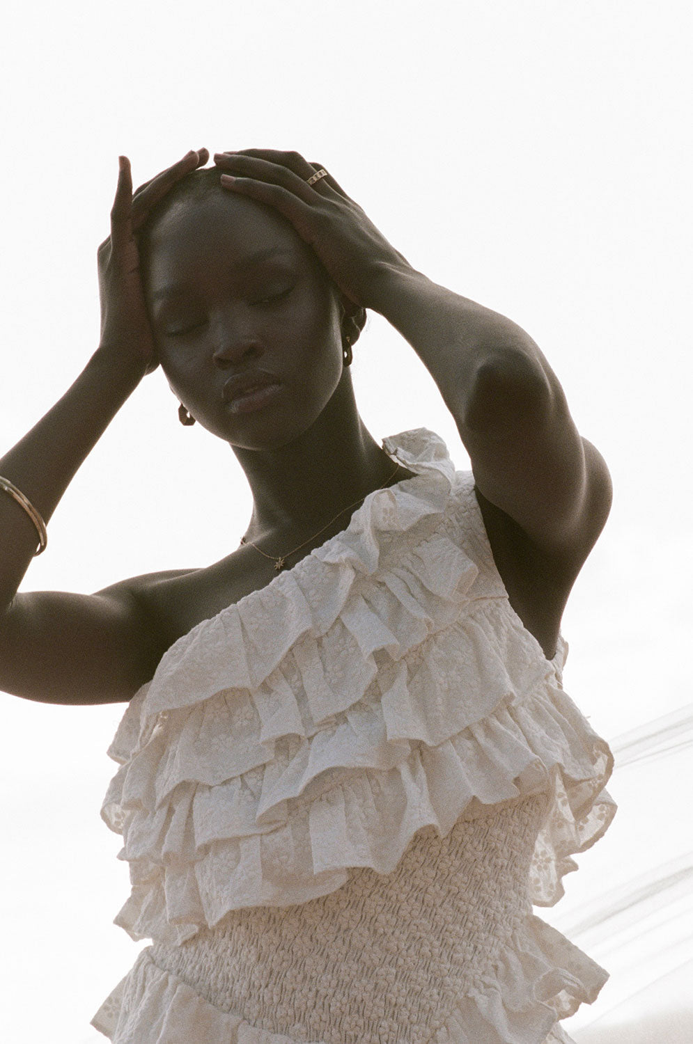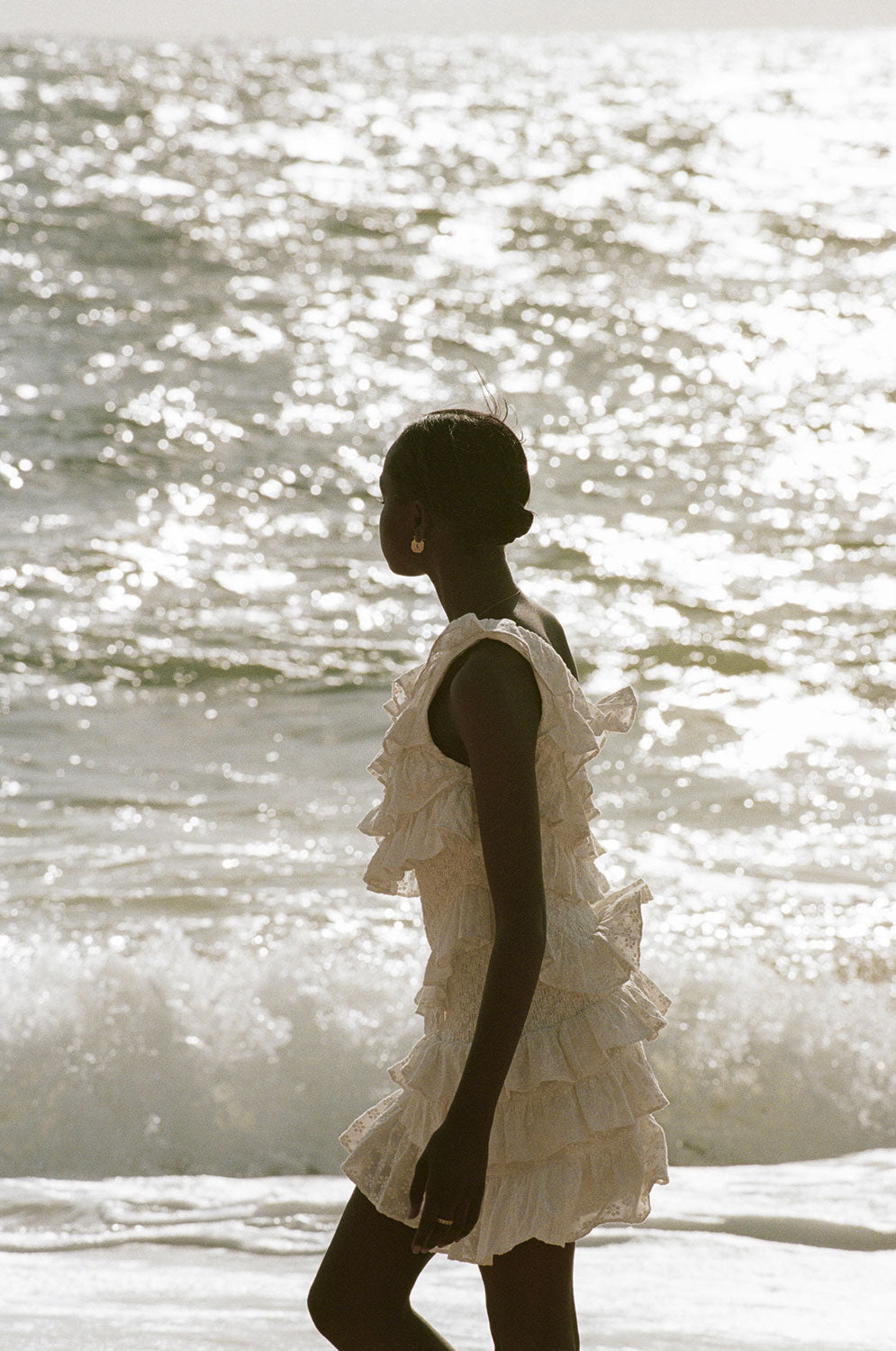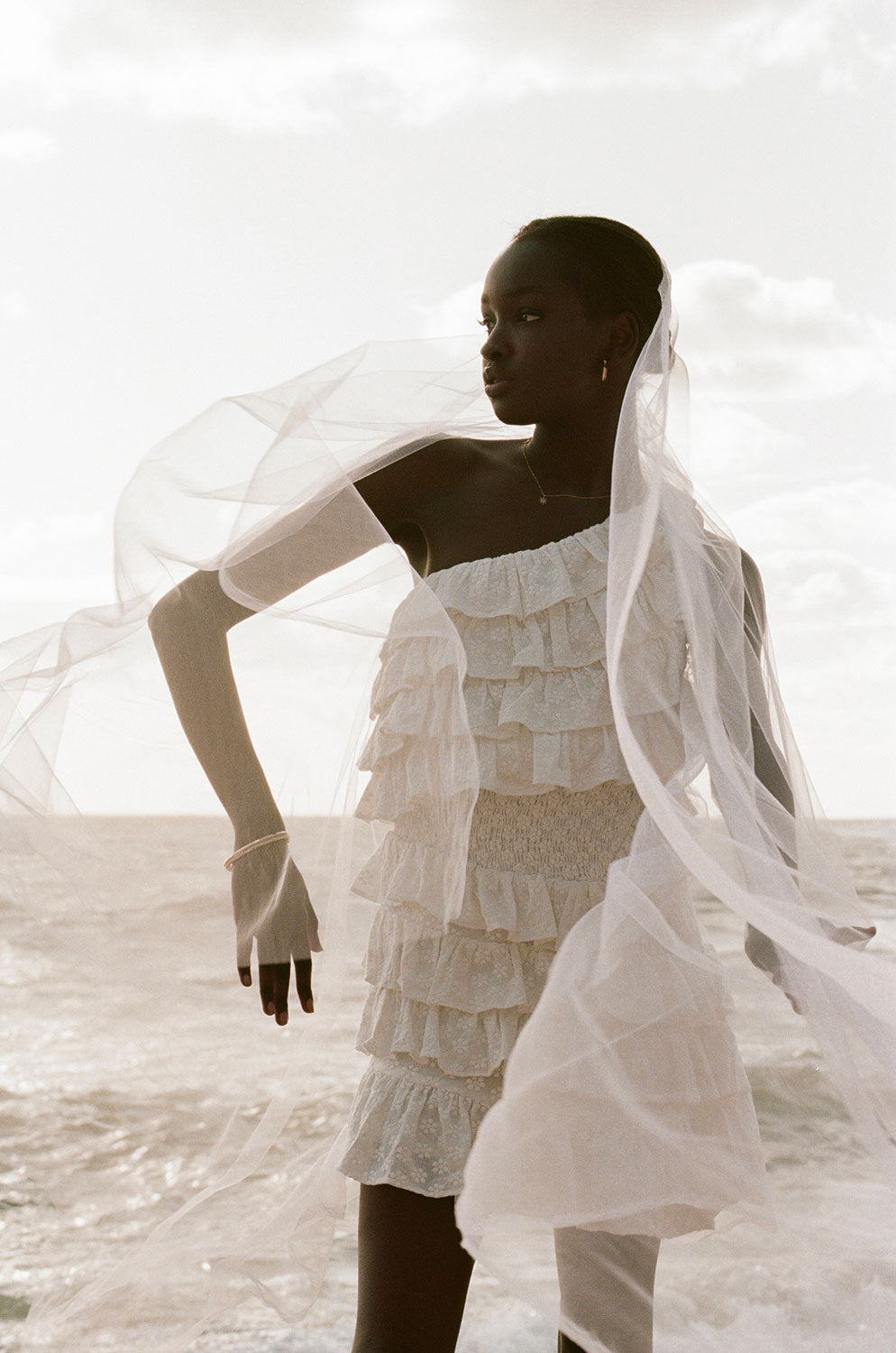 Frills and fitted panels designed to flatter! The Axelia Dress is made from a natural embroidered flower cotton fabric in white. It features an asymmetric neckline with one sleeve, frill details and fitted shirred panels at waist and hip. Dress up your look with the Transparent Mules and bold hoop earrings! Exclusive SABO LUXE design.