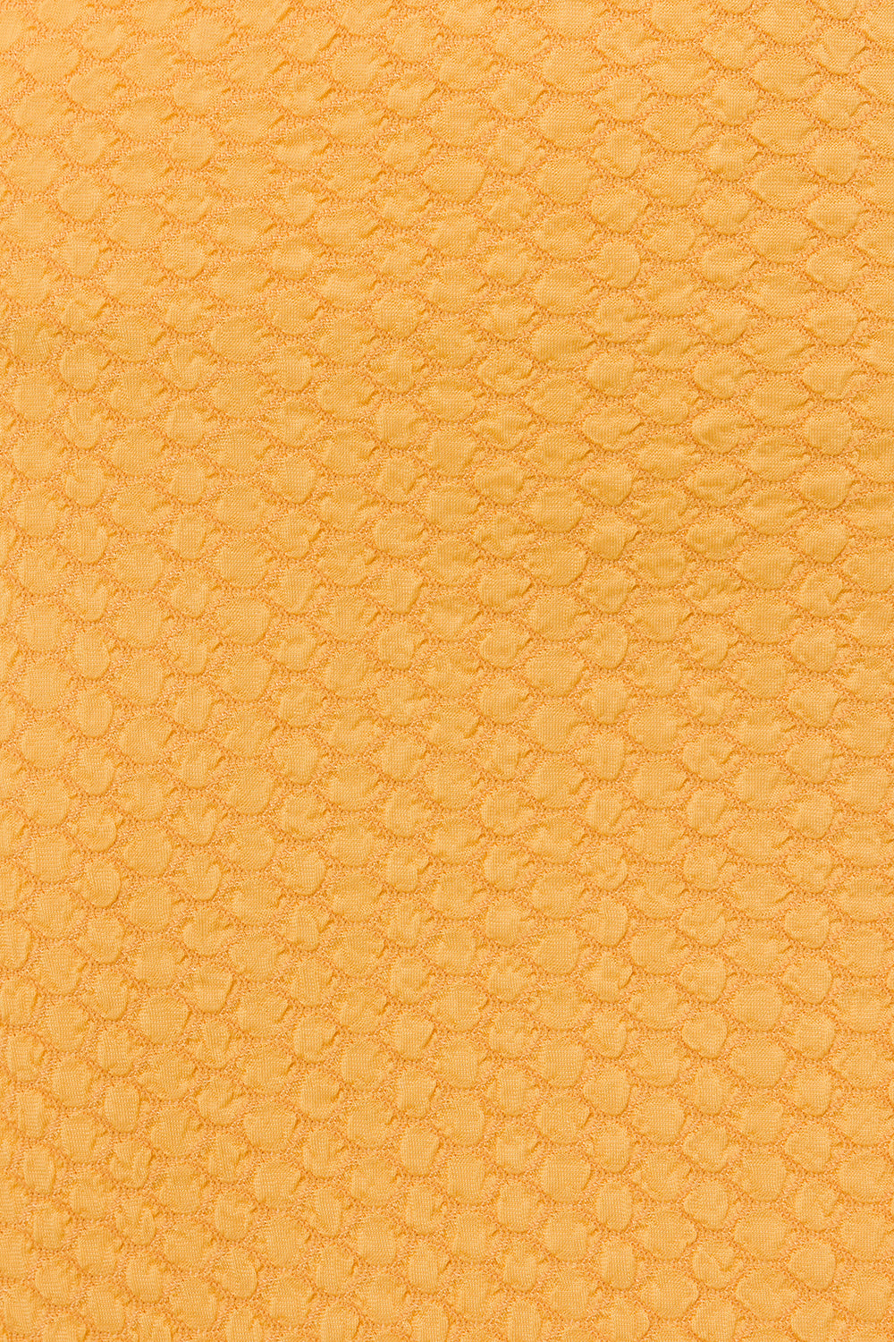 Contour your curves in the Backless Aluer Dress, made from a stretchy textured bubble fabric in a golden hue. It is a fitted style featuring an open back with tie closure, draw details at sides of bust, curved cutouts at waist and a midi length skirt. Dress it up for a night out with the Zenyth Heels! Designed exclusively by Sabo.