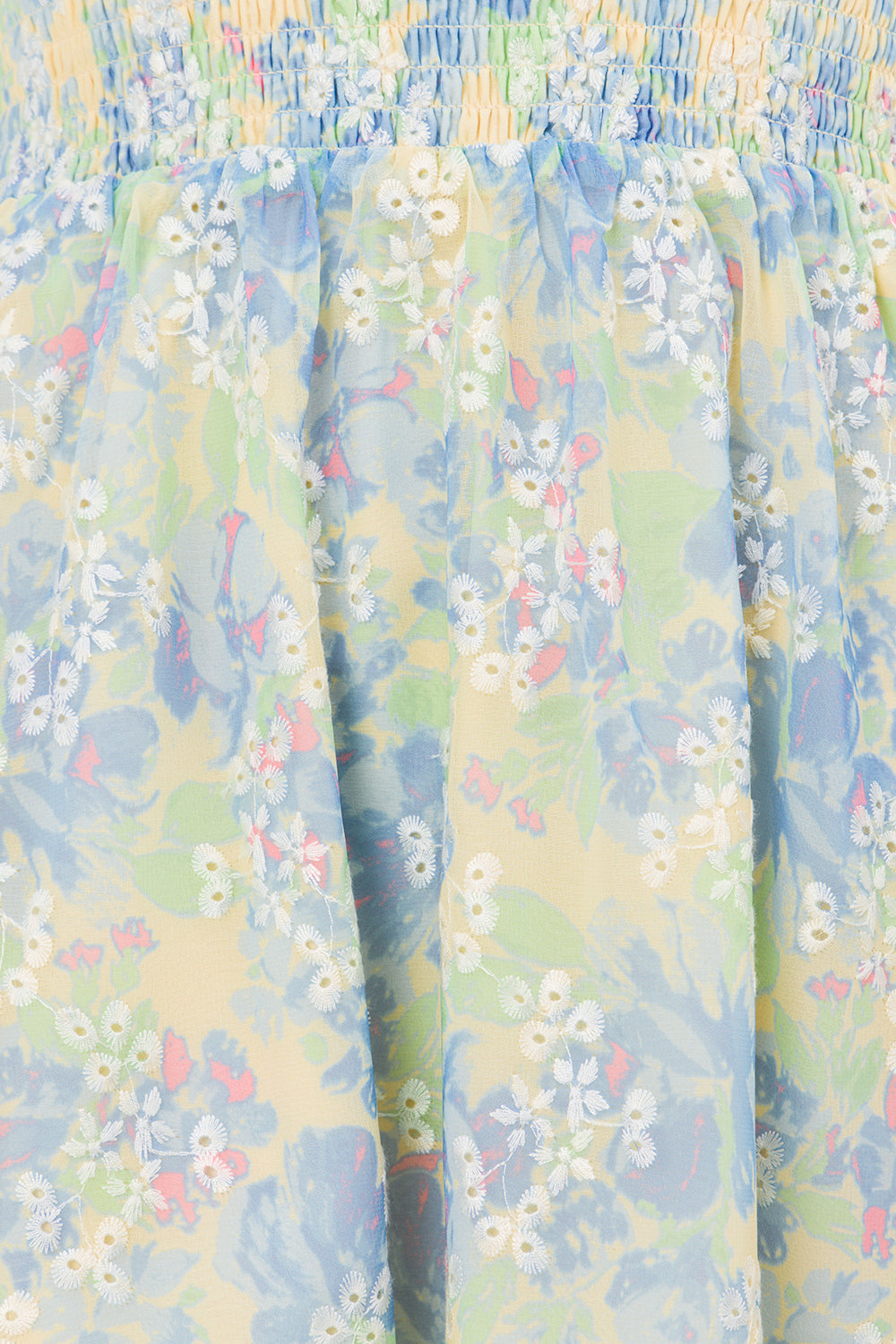 A super cute design with our exclusive new ever blue floral print! The Backless Mika Dress is made from a printed chiffon fabric with white embroidery details throughout. It features an open back with strappy ties, high neckline, fitted shirred panel across waist and a flouncy mini skirt. Style with white sandals! Designed exclusively by Sabo.