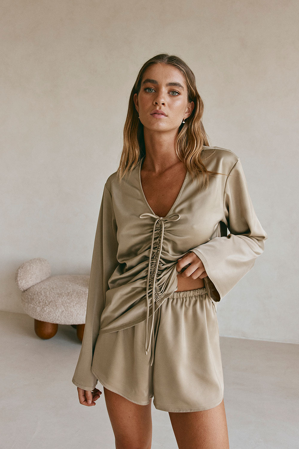 Elevate your look with the Bindi Shorts, made from a luscious silky fabric in a khaki hue. They are a high waisted style featuring a thin elasticated waist, drawstring and high-low hems. Get the set with the Bindi Top and style with the Lena Mules. Designed exclusively by Sabo.