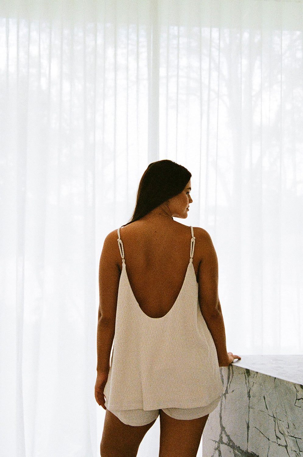*BACK IN STOCK* The perfect blend of comfort and style, the Boston Top is made from a stunning textured fabric in a sandy hue. It is a cami style featuring thin adjustable straps, V neckline, scooped back and flowy a-line hem. Style your look with the Boston Shorts and neutral slides. Designed exclusively by Sabo.