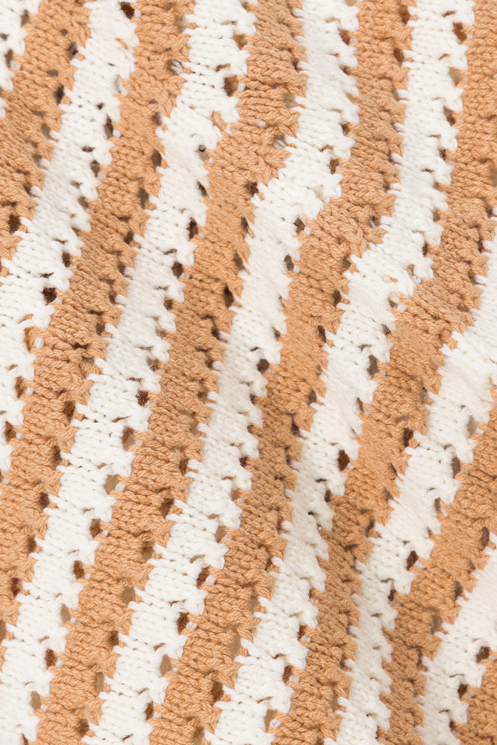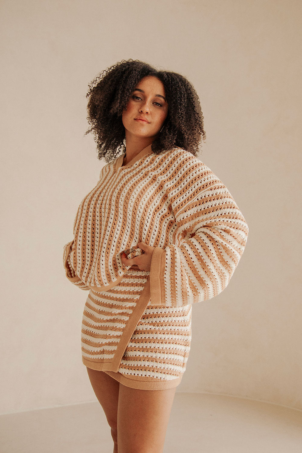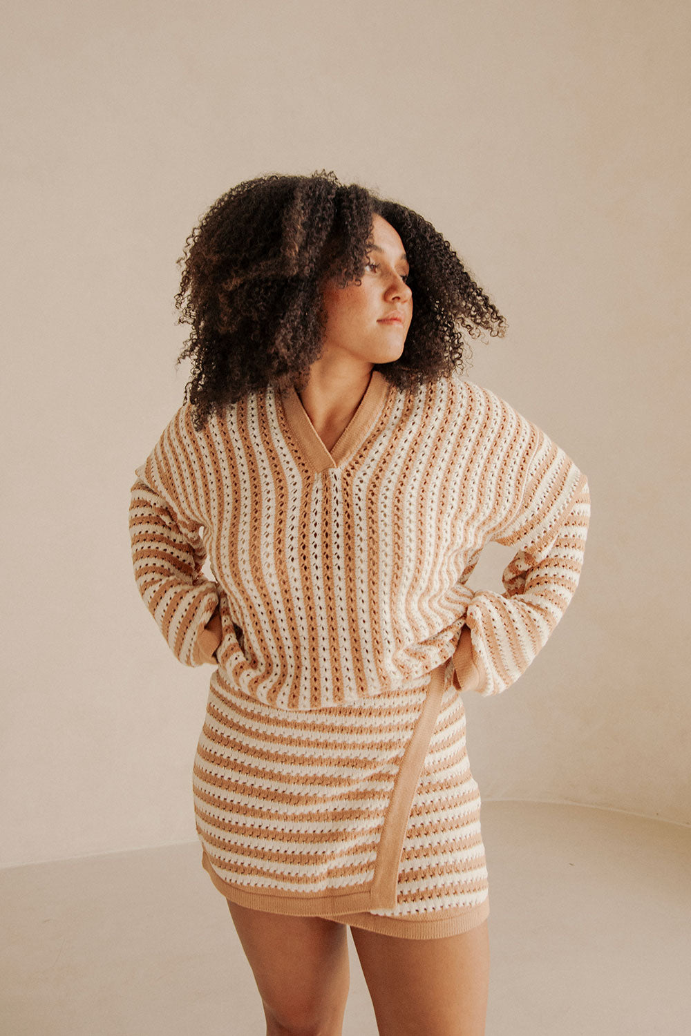 Wear it as a set or style it with a tank! The Bryn Skirt is made from a high quality cotton blend knit with tan and white stripes. It is a high waisted style featuring contrast tan ribbed trims, a wrap panel at front with button closure and mini length. Get the set with the Bryn Top! Designed exclusively by Sabo.