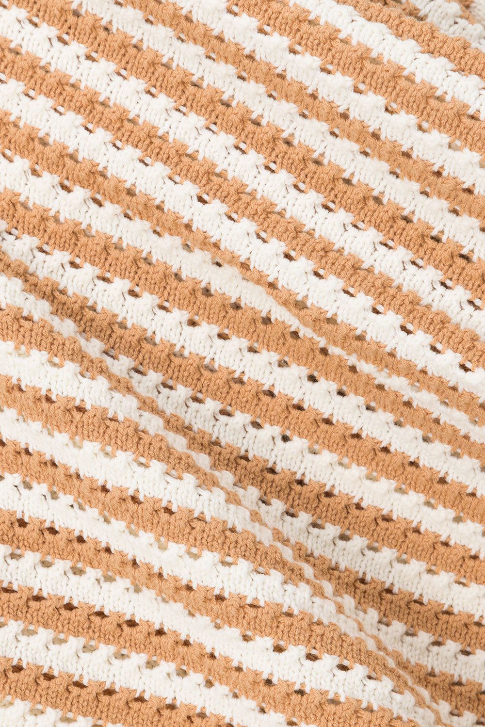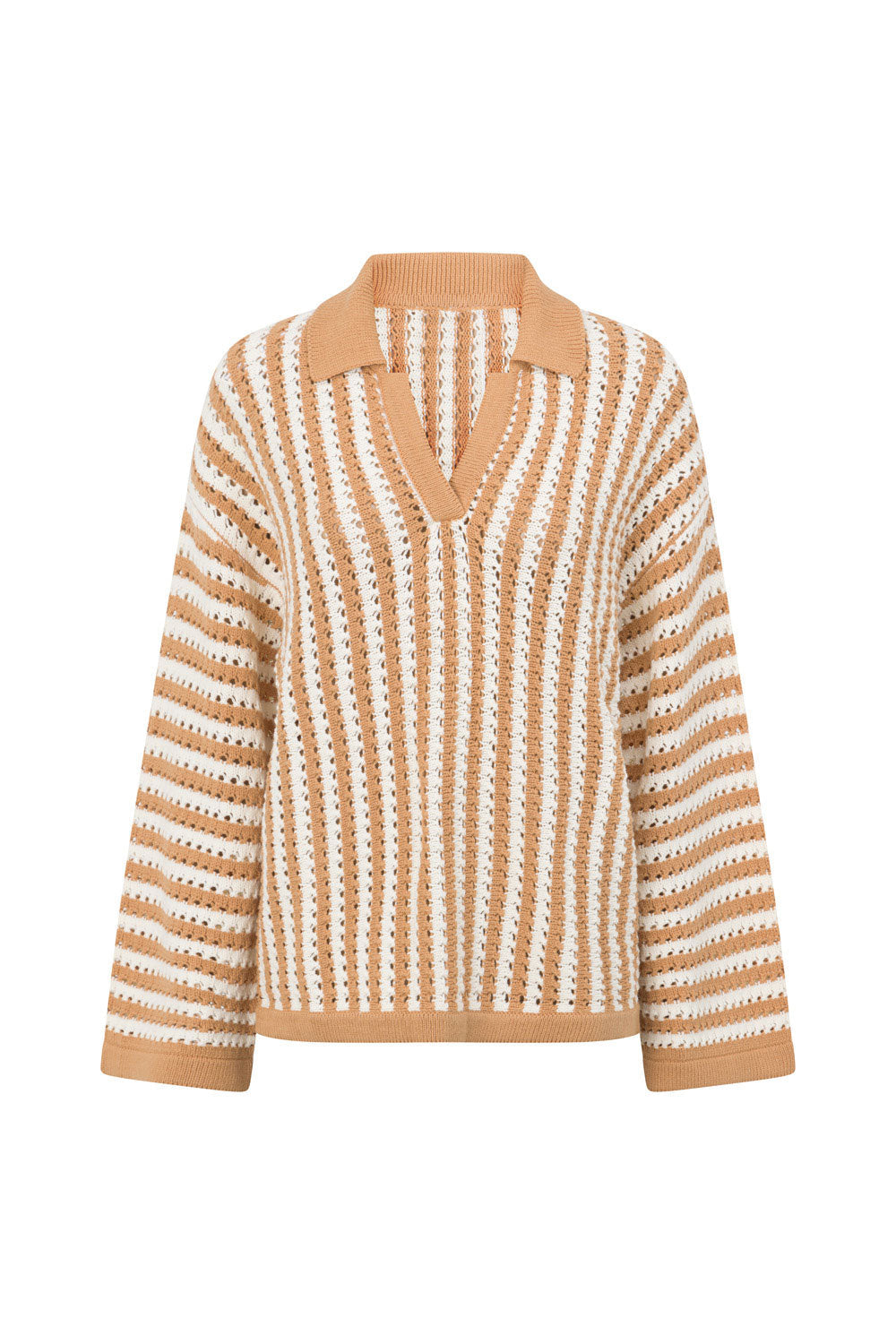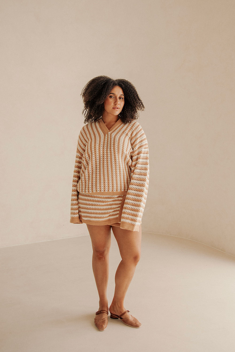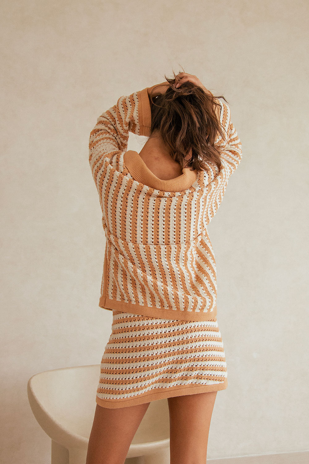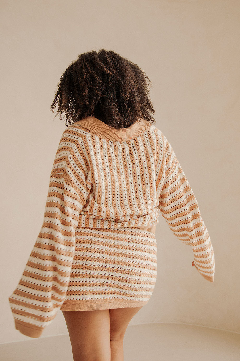 Wear it as a set or style it with jeans! The Bryn Top is made from a high quality cotton blend knit with tan and white stripes. It is a relaxed style featuring a V neckline, drop shoulders, full length sleeves and contrast tan ribbed trims. Get the set with the Bryn Skirt! Designed exclusively by Sabo.