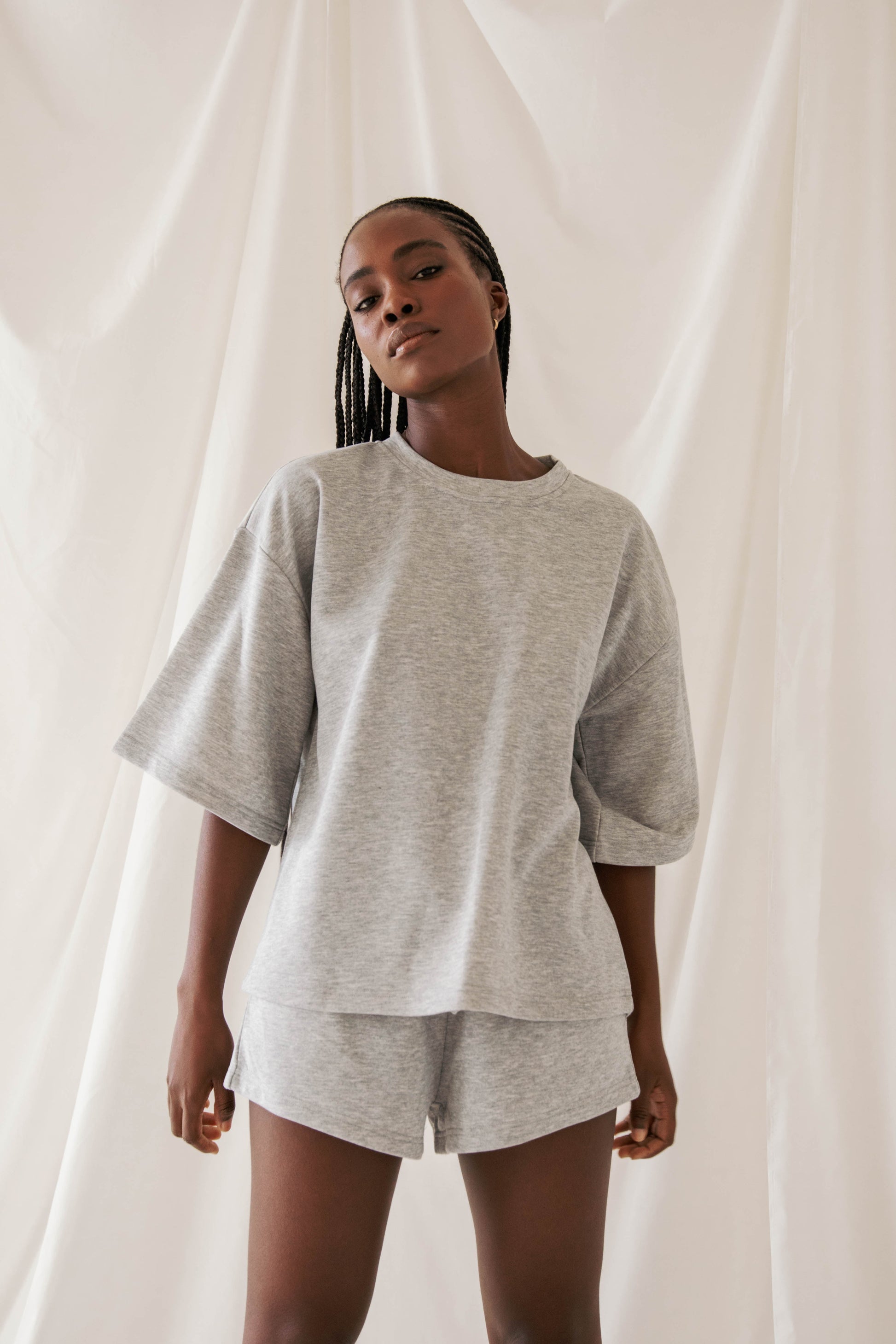 The super cosy Camp Shorts are made from a natural cotton terry back sweater fabric in a marl grey hue. They are a high waisted style featuring an elasticated waist with drawstring and twin pockets at sides. Get the look and pair with the Camp Top! Designed exclusively by Sabo.