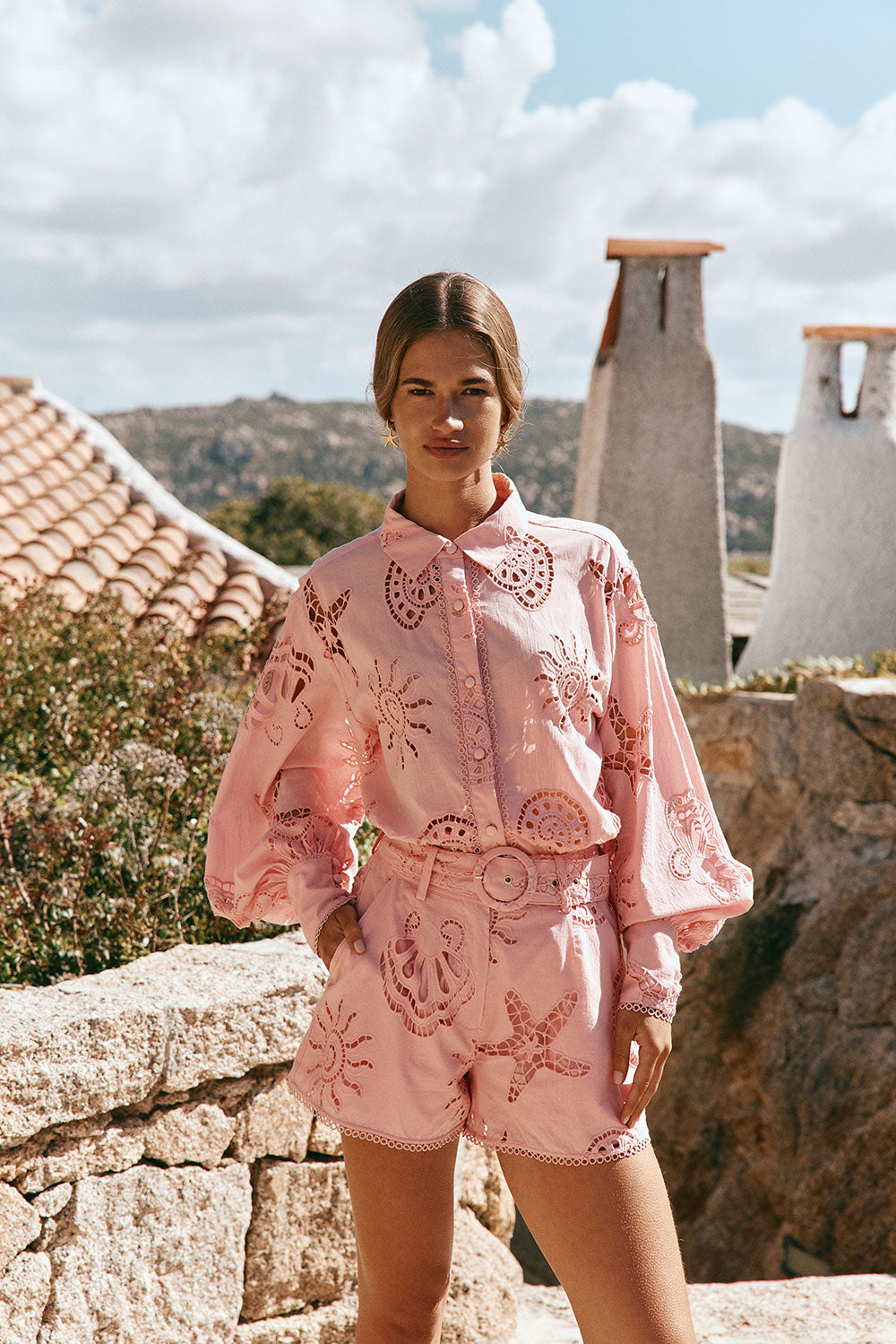 The Carilo Shorts in our Corallo Rosa delicate custom cutwork fabric from our Summer '25 collection. A fully lined broderie voile pair with twin side pockets, matching belt and high-low hems with loop trim detail. Pair with the Carilo Top. Exclusive ZĀCO design.
