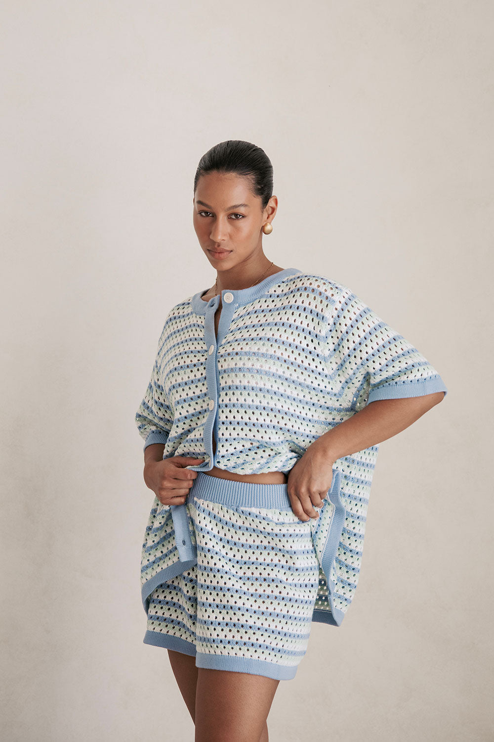 A trans-seasonal style with a vintage flair! The Chantel Knit Shorts are made from a natural cotton diamond jacquard knit with blue, mint and white stripes. They are a high waisted style with an elasticated waist and contrast blue trims. Get the set and style with the Chantel Knit Top! Designed exclusively by Sabo.
