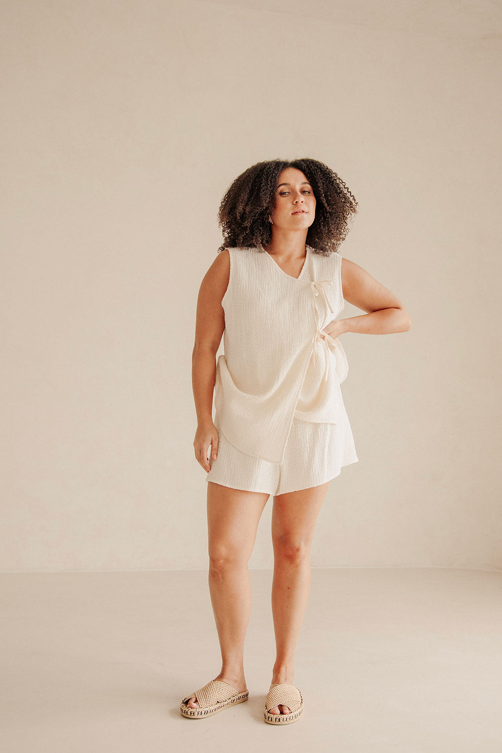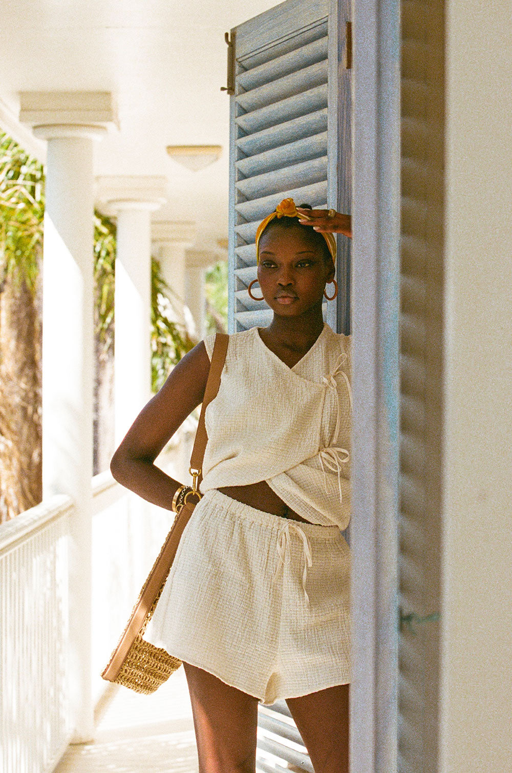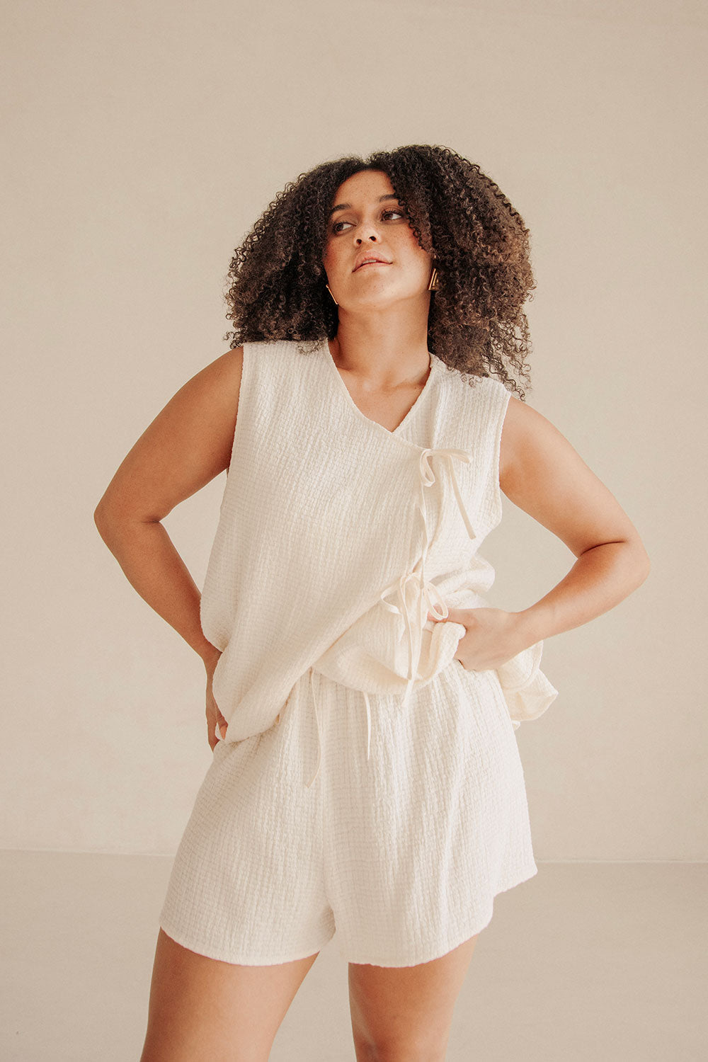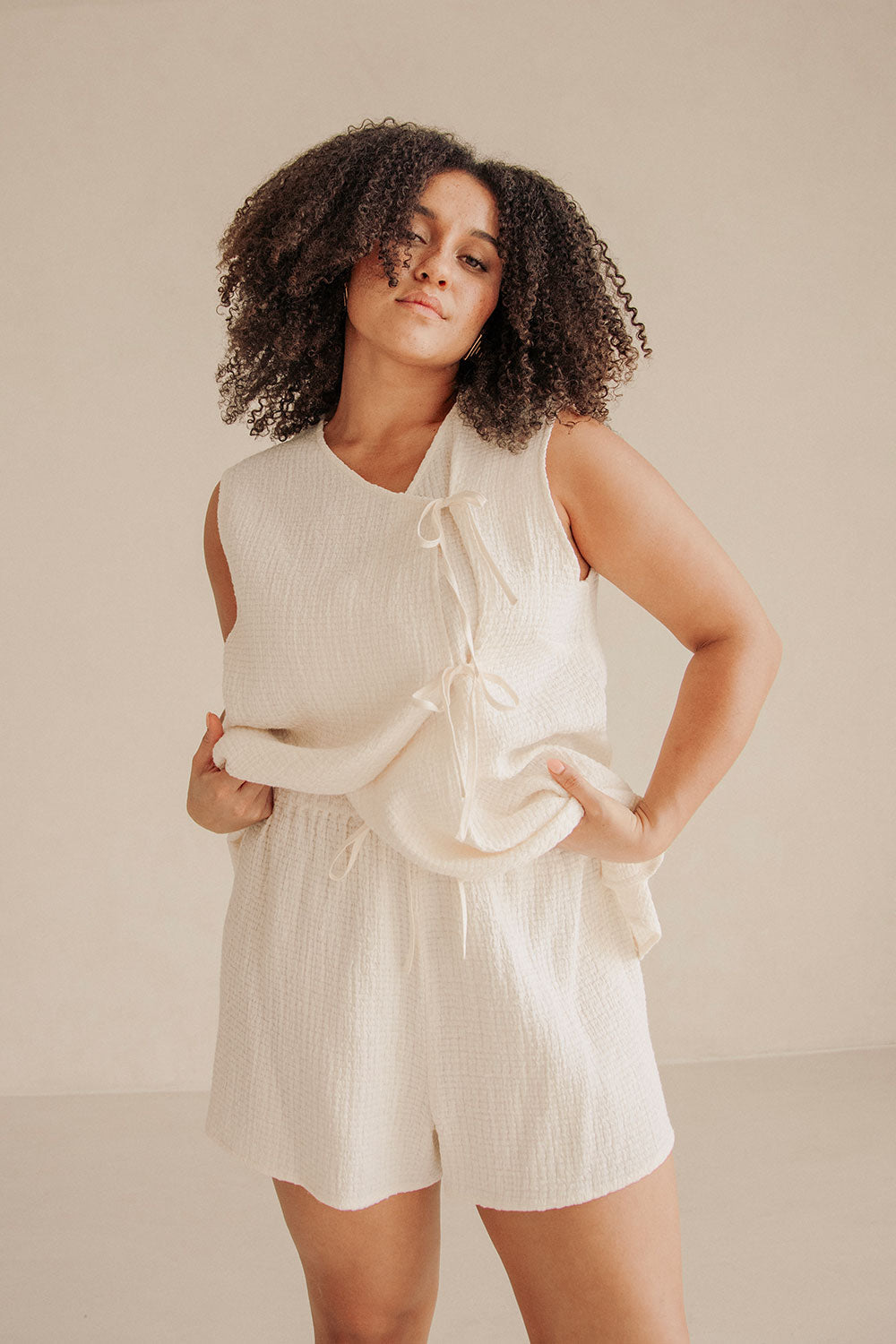 A super cute cosy set, the Ciel Shorts is made from a high quality textured cotton fabric in a cream hue. They are a high waisted style featuring an elasticated waist with drawstring and high-low hems. Get the look with the Ciel Top! Designed exclusively by Sabo.