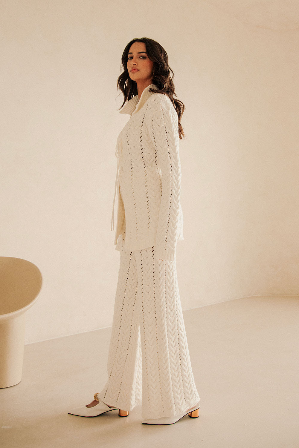 The most cute and cosy set! The Cleo Pants is made from a high quality cable knit in a cream hue. They are a high waisted style featuring an elasticated waist and relaxed fit. Get the look with the Cleo Top! Designed exclusively by Sabo.