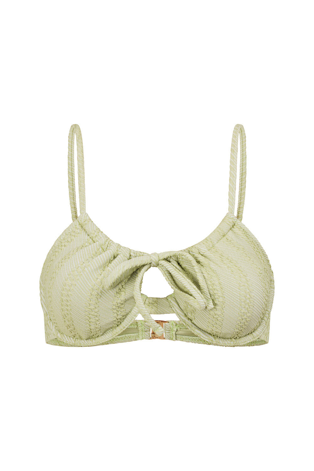 The perfect top for a large bust! The Cruiser Balconette Top is made from a high quality stretchy bubble fabric with a self stripe in a soft green hue. It features an adjustable draw neckline with thick strap and tie at centre bust, adjustable straps, underwire at cups and clasp closure at back. Pair with the Cruiser or East Coast Bottom! Designed exclusively by Sabo.