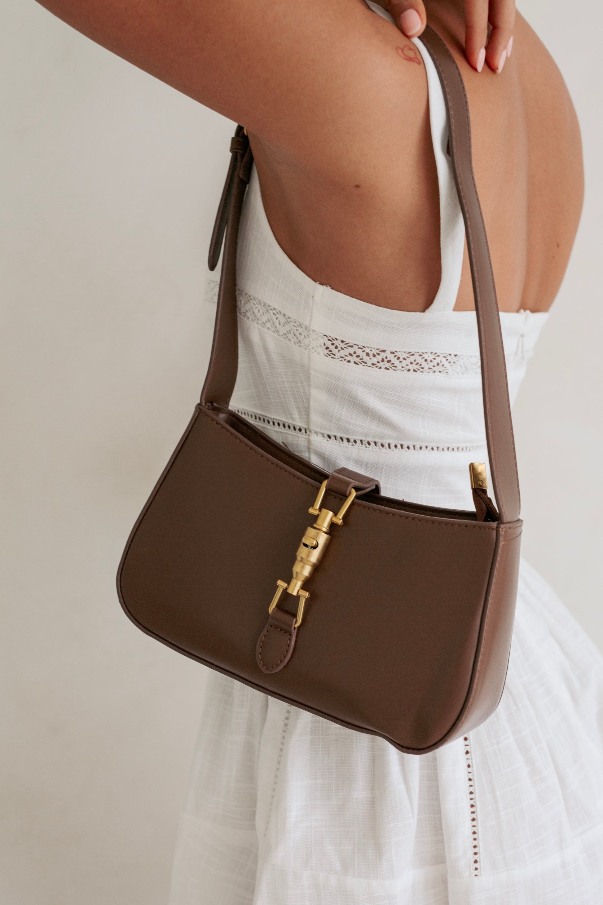 The vintage inspired Davina Bag is made from a vegan leather in a stunning chocolate brown hue. It features gold hardware closure, zipper and adjustable strap length. The perfect way to level up your look!