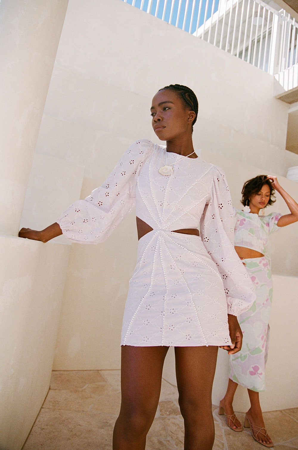 A perfect blend of cutouts and flounce, the SABO LUXE Delita Cutout Dress is made from a high quality natural cotton broderie fabric in a pleasant lavender hue. It features full length puff sleeves, cutouts at waist, mini length skirt and contrast white round trim panels. Pair with the Dia Heels for your next night out! Designed exclusively by Sabo.