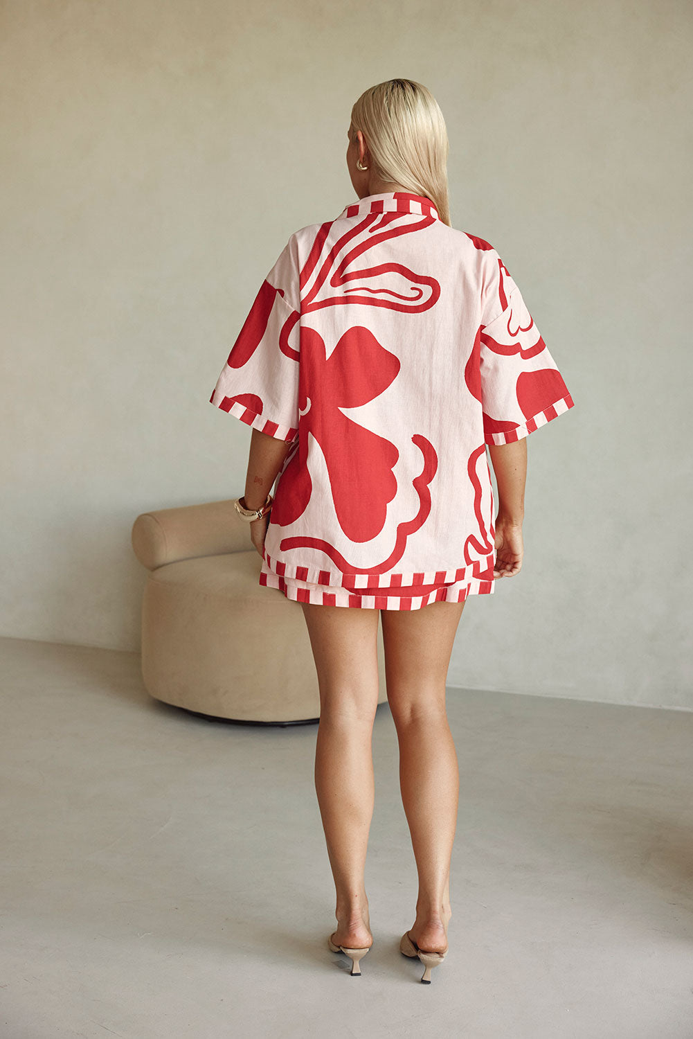 The relaxed vacation inspired Delphia Top is made from a natural linen cotton blend fabric with our exclusive Darling Floral print. It features a relaxed fit with boxy sleeves, collar and low lapel, functional covered button down opening at front and contrast stripe trim details. Get the set with the Delphia Skirt. Designed exclusively by Sabo.
