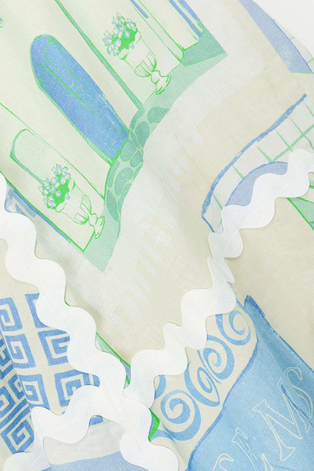 The Deluca Dress in our exclusive Theotokos Ocean print from our Resort '24 collection. A high quality linen maxi style with ric rac trim edge detailing, scooped back, side pockets and an a-line skirt. Exclusive ZĀCO design.