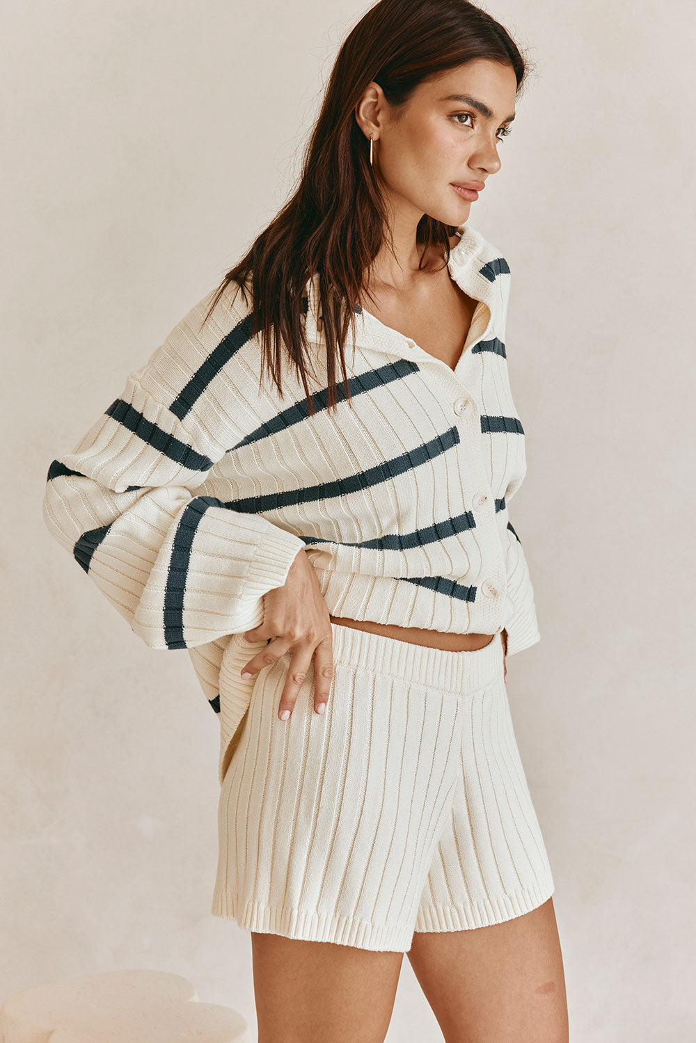 A super cosy set and perfect styling piece, the Depp Shorts are made from a high quality cotton blend rib knit in white. They are a high waisted boxy style featuring an elasticated waist and ribbed trims. Style with the Depp Top or Cruz Cardigan. Designed exclusively by Sabo.
