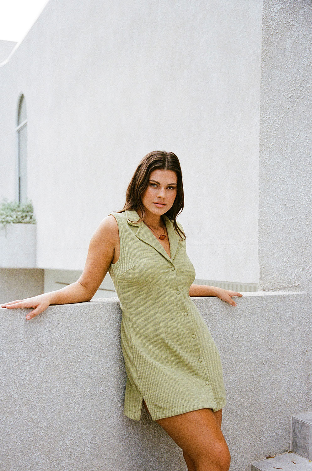A 70's inspired look, the Elixir Dress is made from a textured fabric in a khaki green hue. It features a low lapel collar neckline with covered button details down centre front and a mini length skirt. Pair with neutral slides and the Raven Sunglasses for a super stylish look! Designed exclusively by Sabo.