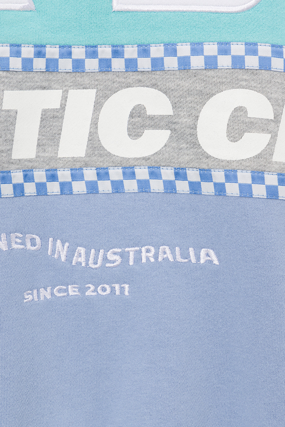 Obsessed with this colour way! The Elm Sweater is made from a natural terry back cotton sweater fabric in marl grey, aqua and blue hues. It is a relaxed style featuring a crew neck, blue ribbed trims on neckline and sleeve cuffs, extra long full length sleeves with wide cuffs and embroidery, patch and tape detailing throughout. Pair with bike shorts! Designed exclusively by Sabo.