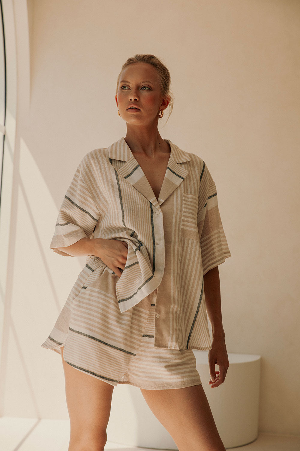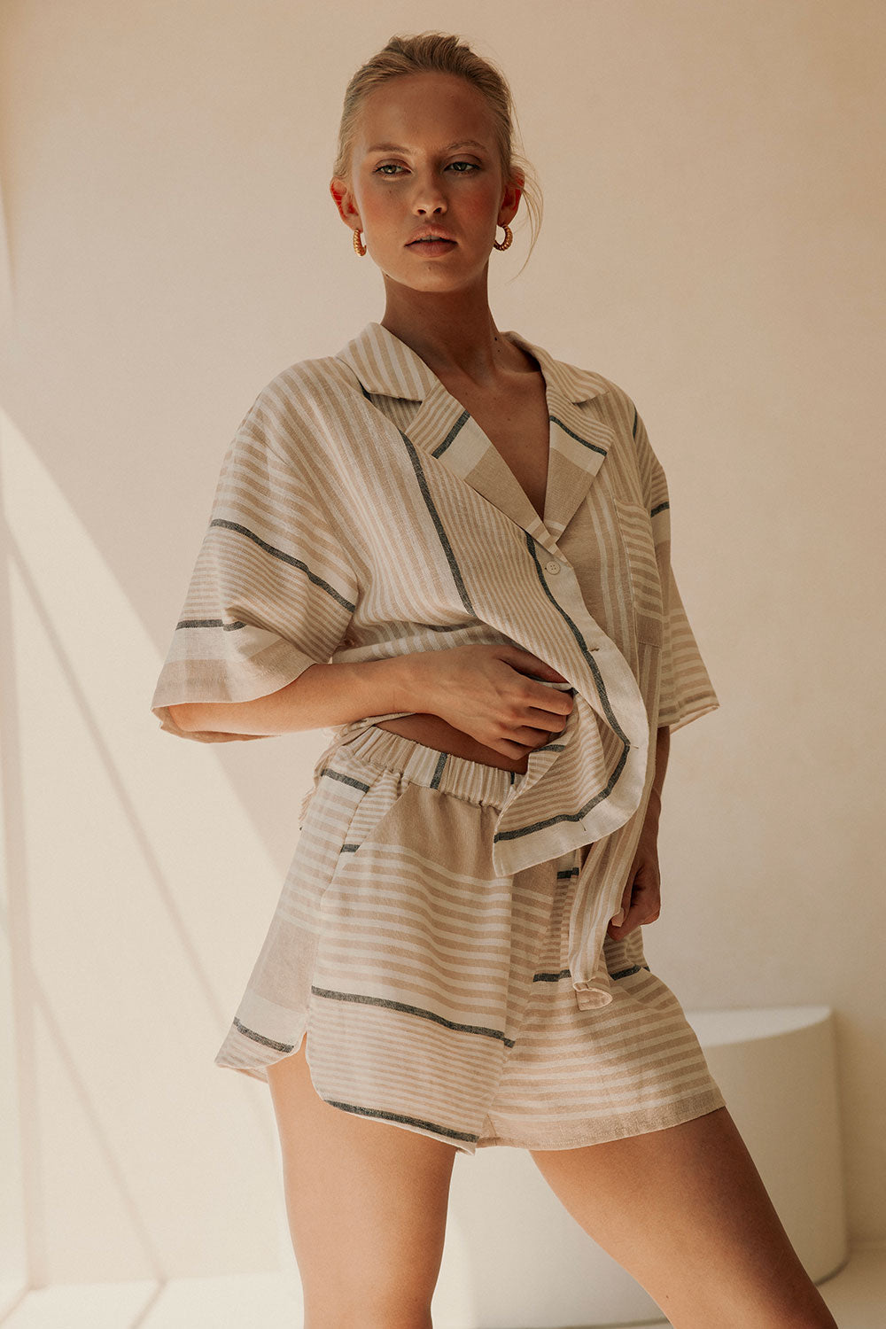 Throw it over bikinis or style with chunky slides, the Enza Shorts are made from a high quality natural linen cotton blend fabric with beige, white and charcoal stripes. They are a high waisted style featuring an elasticated waist, twin pockets and rounded hems. Get the look with the Enza Top! Designed exclusively by Sabo.