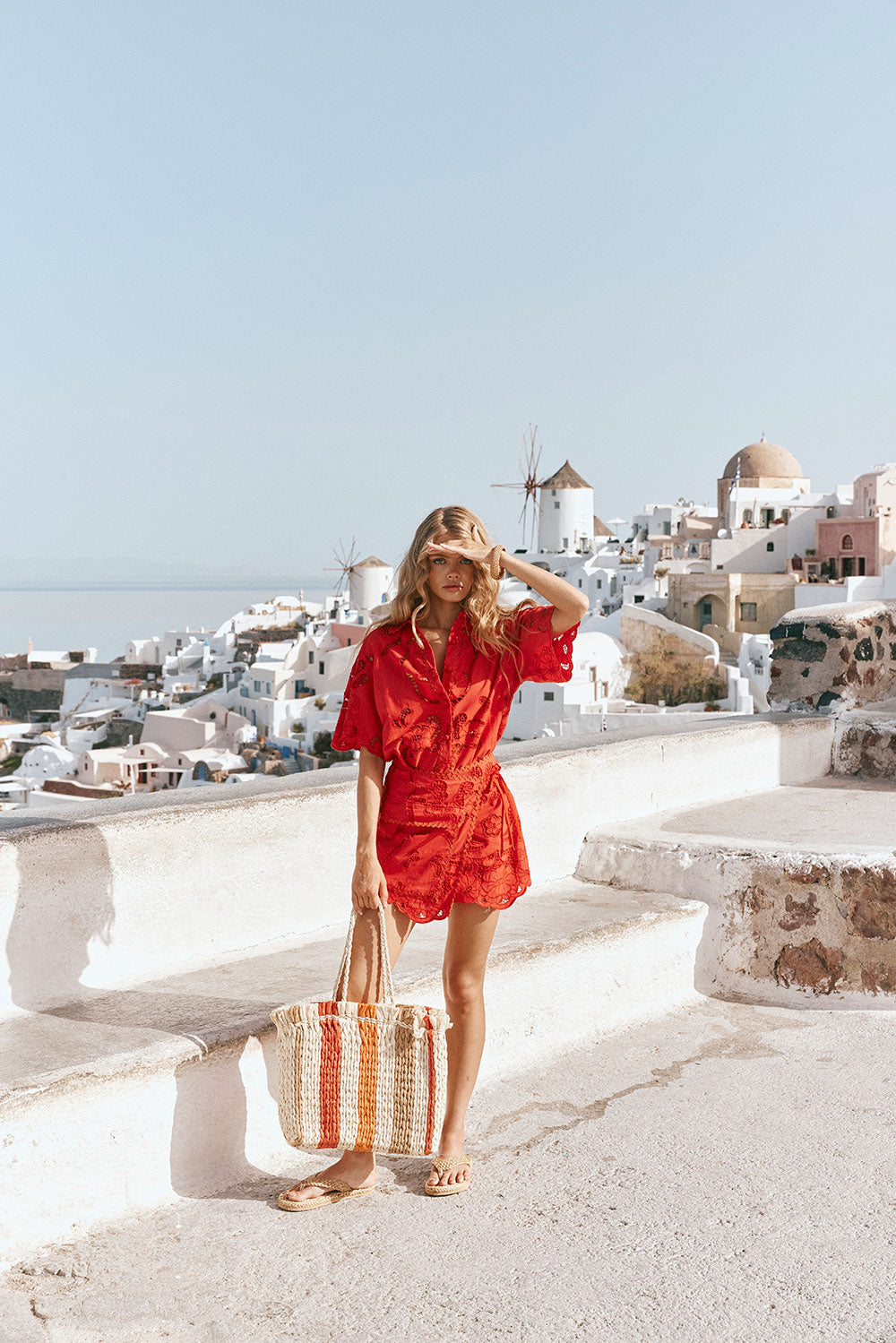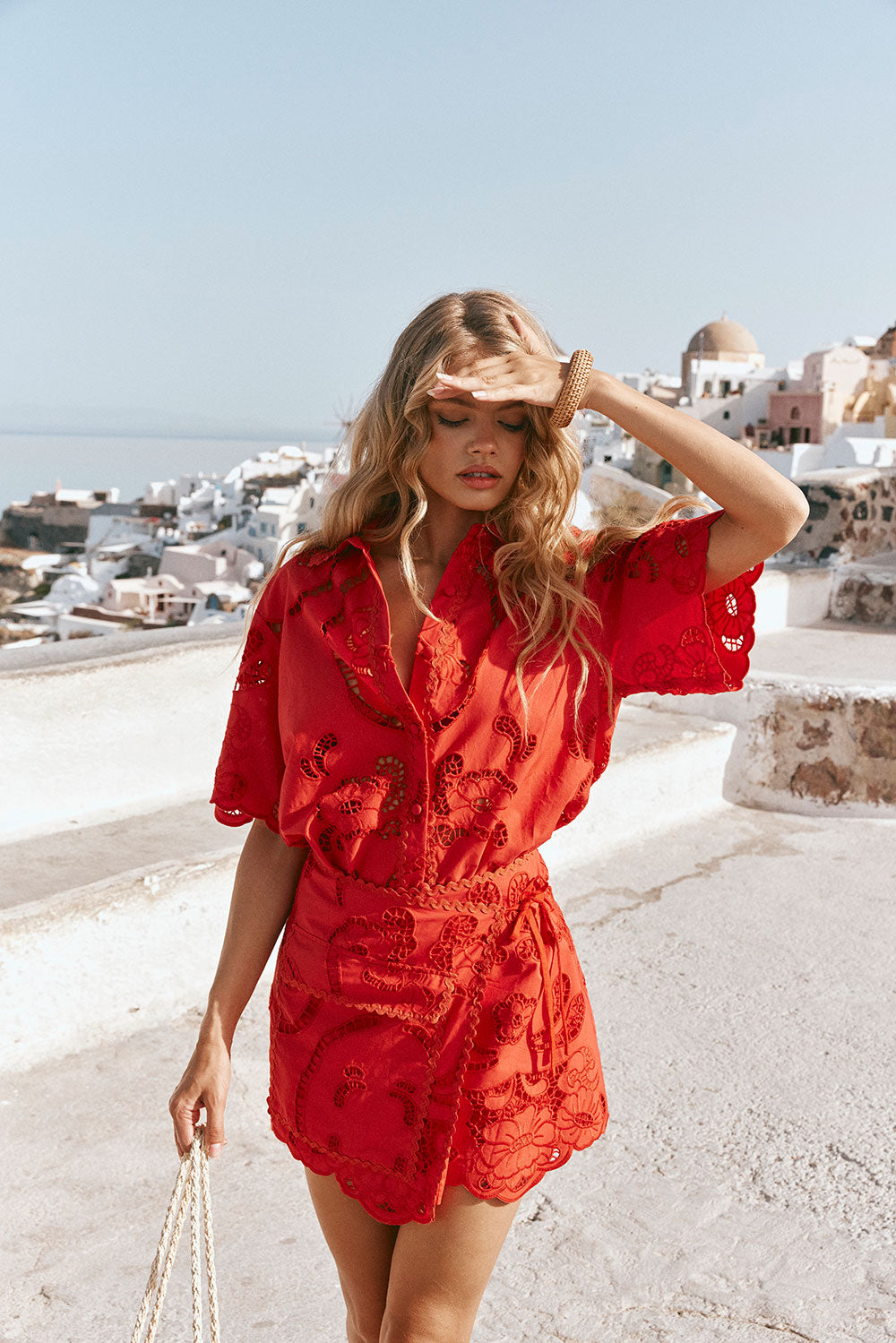 The Florentina Skirt made in our luxurious cotton broderie poplin fabric from our Resort '24 collection. A mini skirt with cutwork detailing, with ric rac and scalloped trim edges, wrap panel with tie at front and large single pocket detail. Pair with the Florentina Top. Exclusive ZĀCO design.