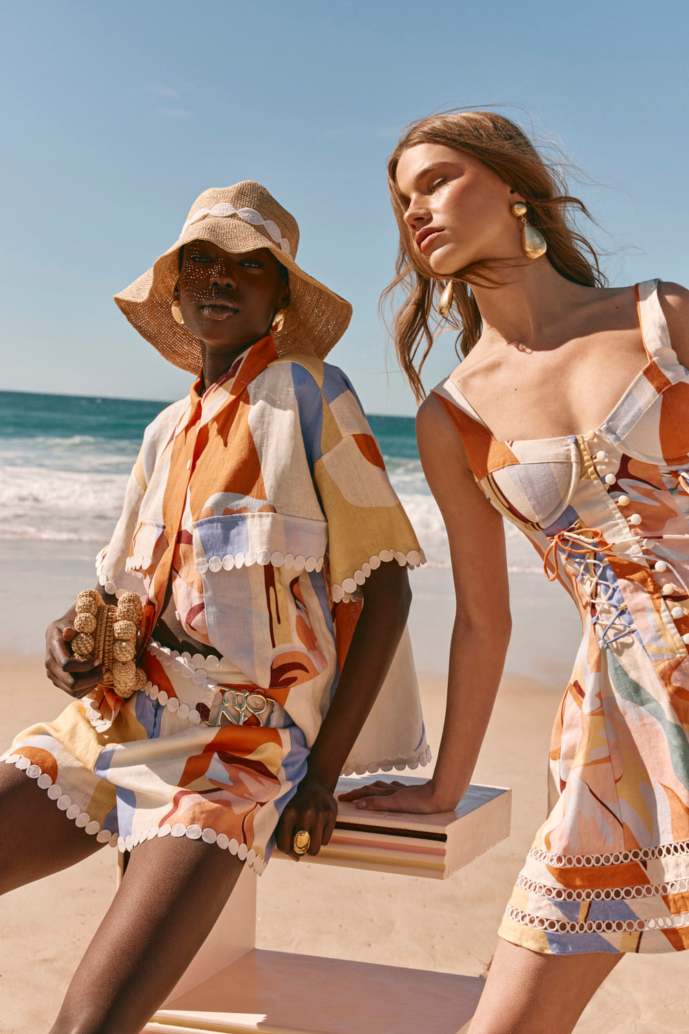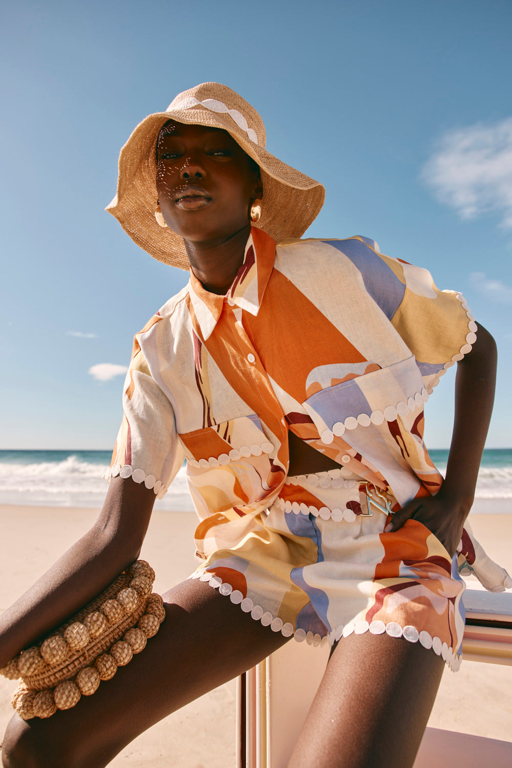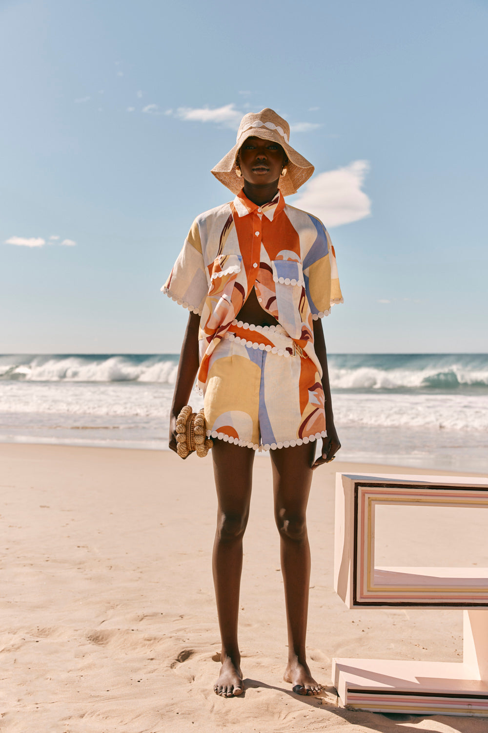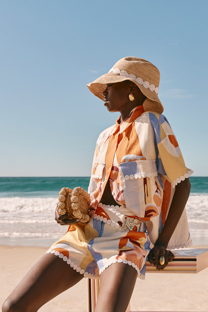The Francesca Top in our exclusive Estivo Dusk print from our Resort '25 collection. A linen boxy fit shirt with collar, twin breast patch pockets with flaps, functional centre front buttons, drop shoulders and short sleeves and contrast circle trim details. Pair with the Francesca Shorts. Exclusive ZĀCO design.