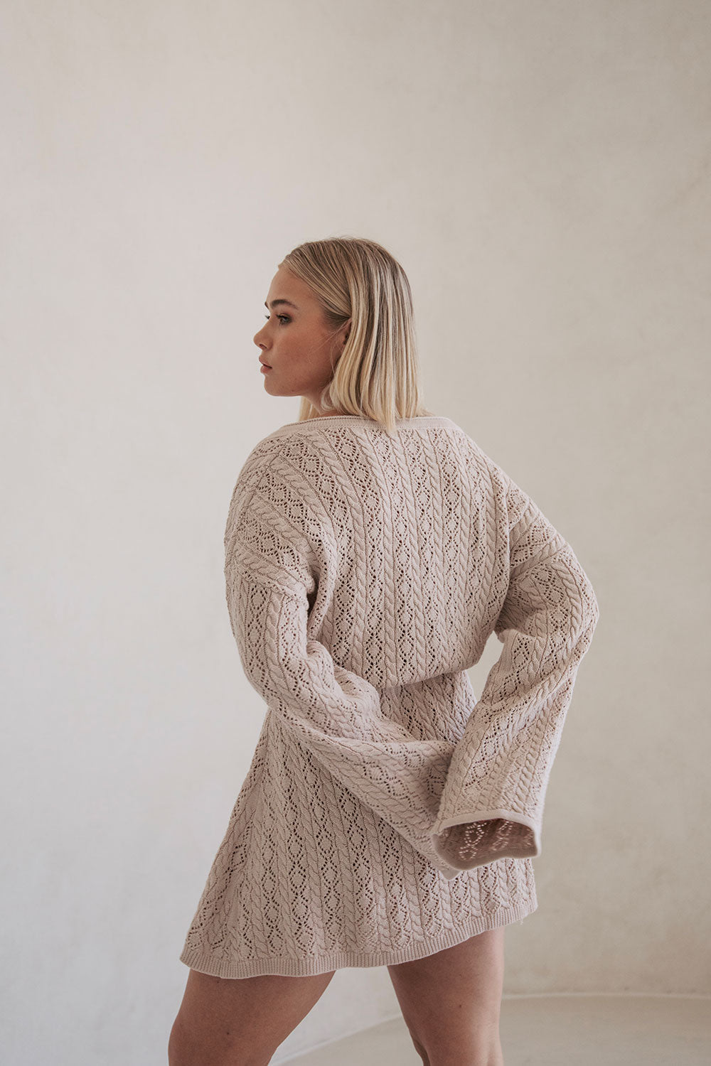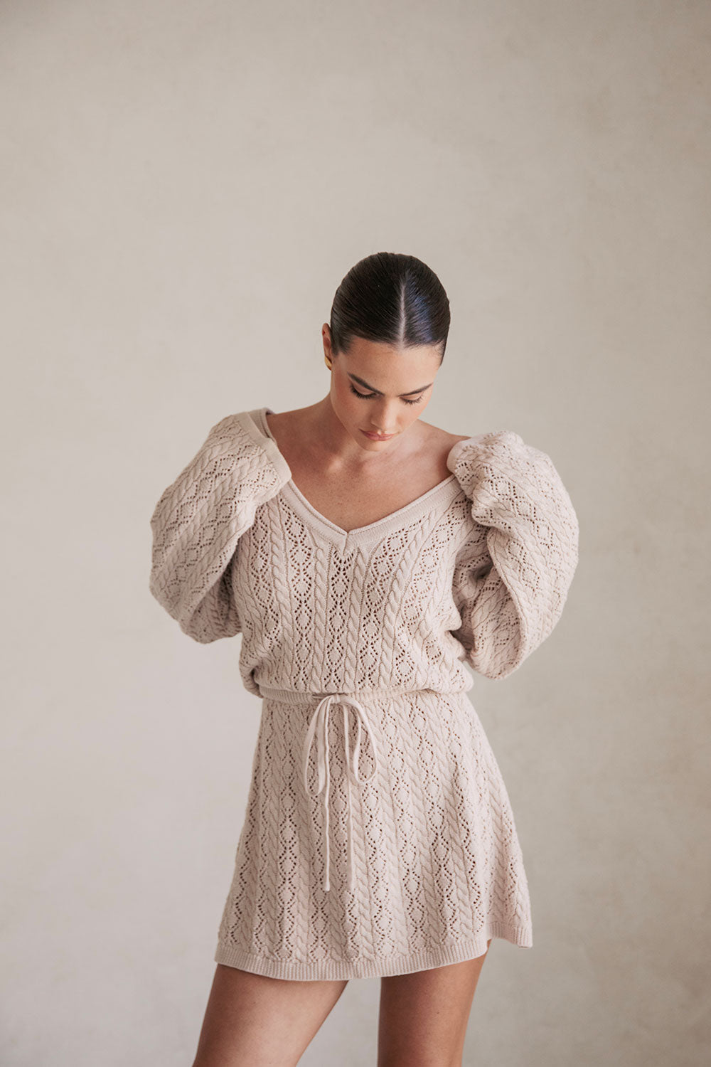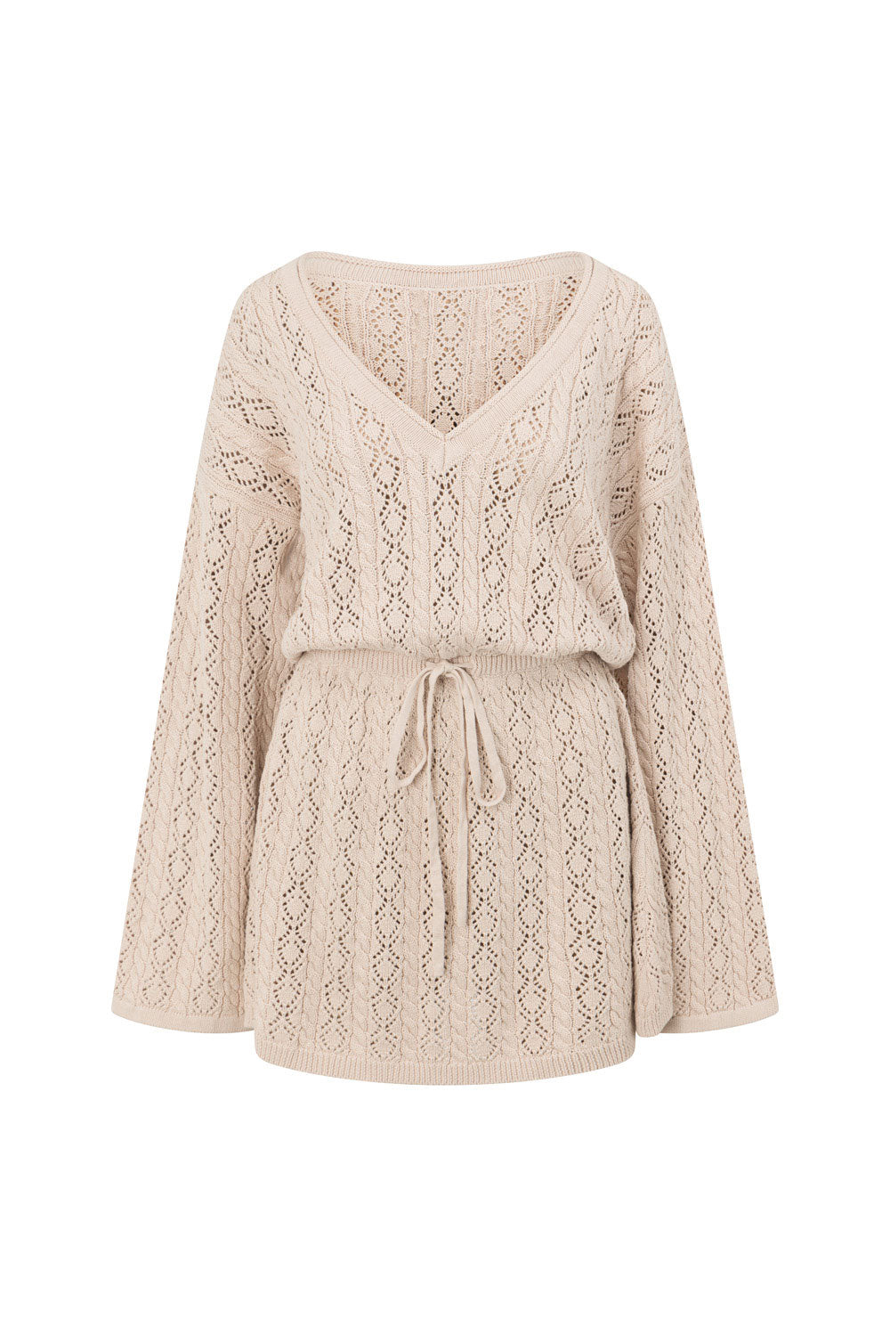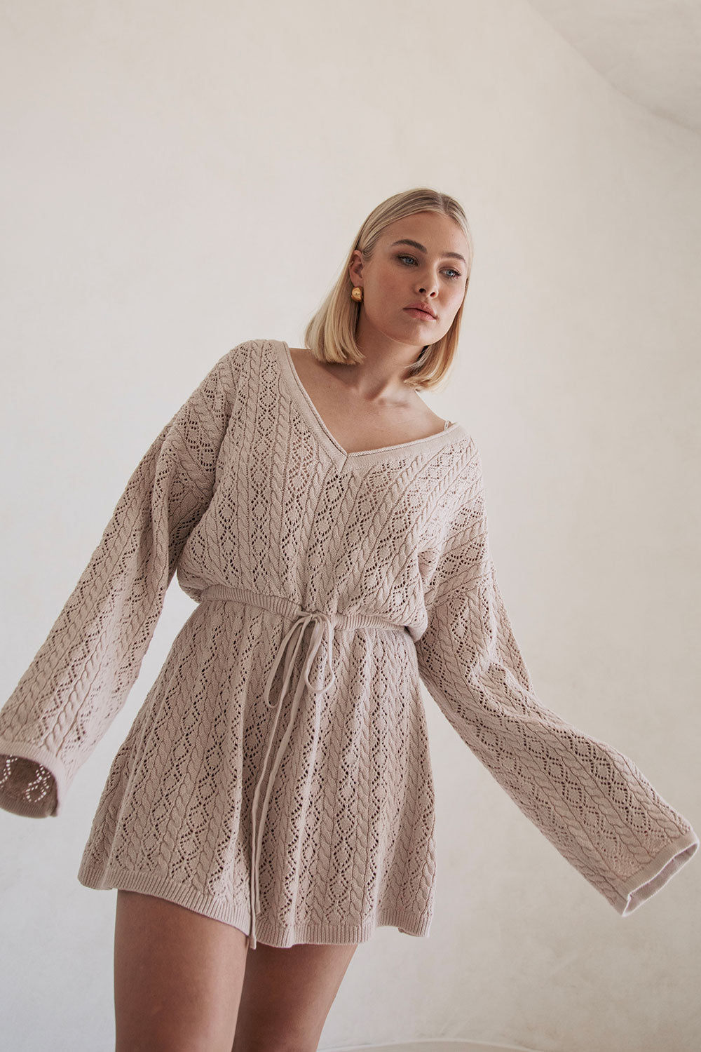 The transeasonal Garnet Dress is made from a high quality natural cotton pointelle knit in a stone hue. It is a relaxed style featuring full length sleeves, wide V neckline, billowing bodice with sinched waist detail and a flouncy mini skirt. Keep it casual with ballet flats or style with high knee boots! Designed exclusively by Sabo.