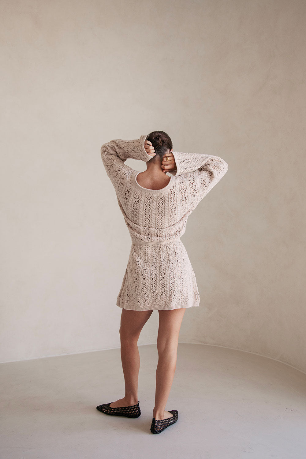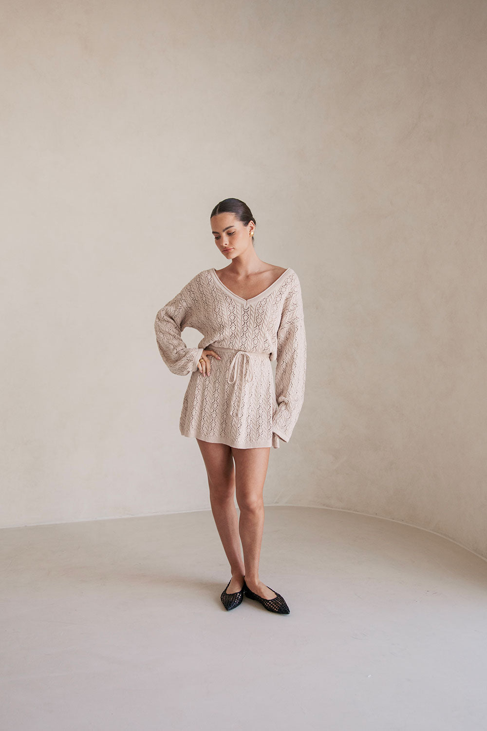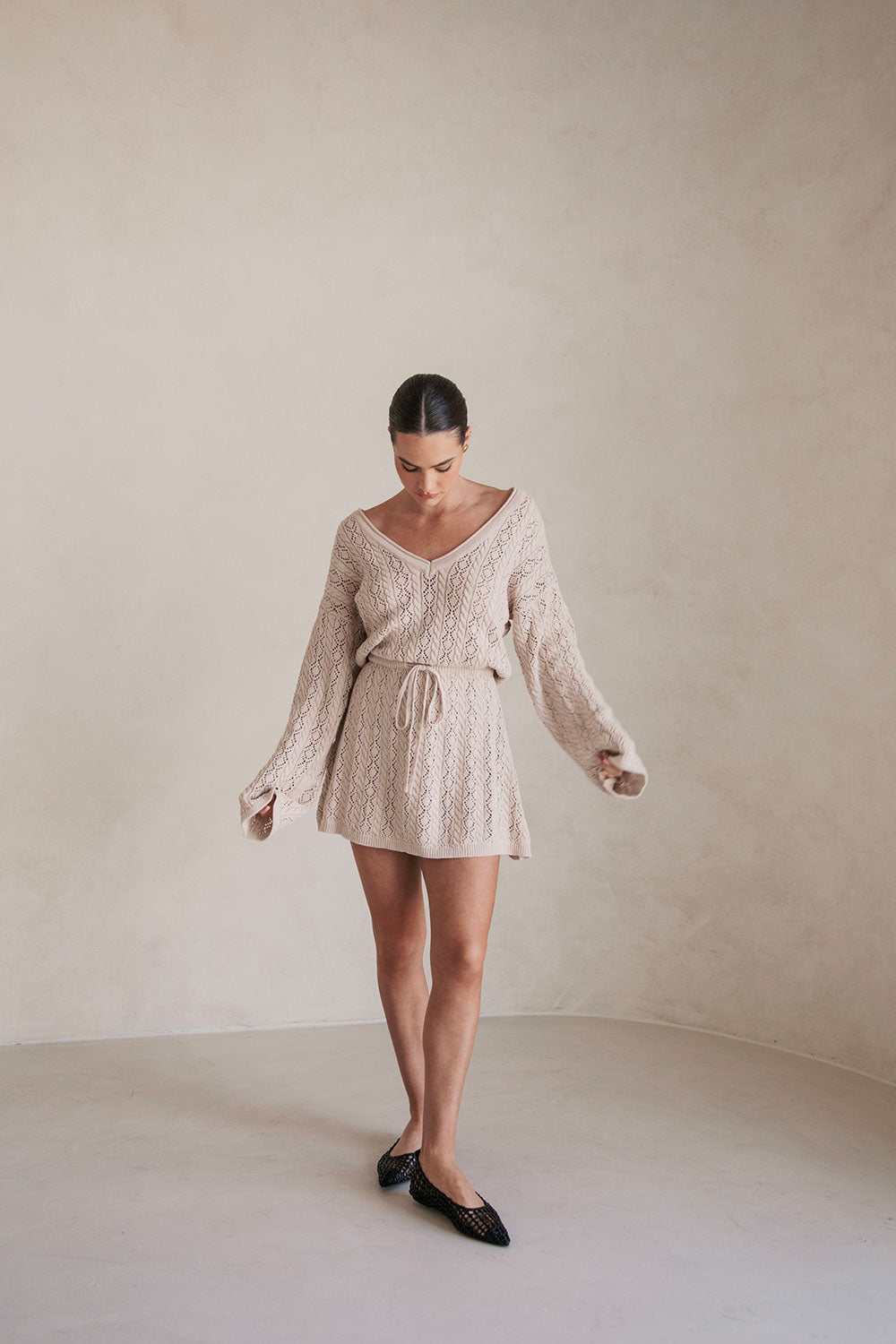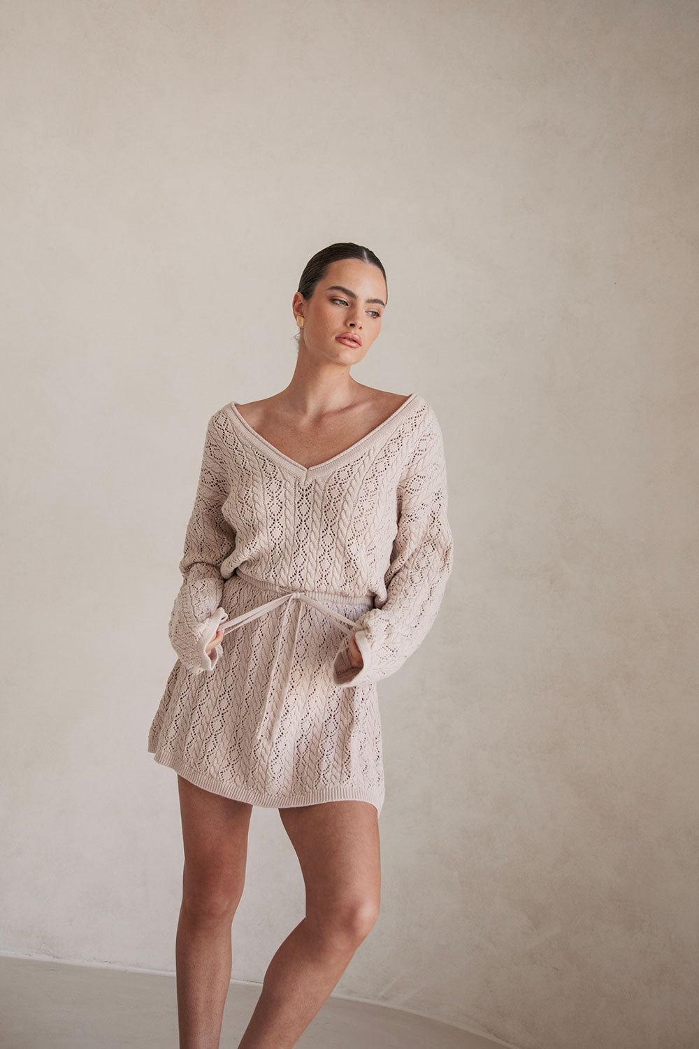The transeasonal Garnet Dress is made from a high quality natural cotton pointelle knit in a stone hue. It is a relaxed style featuring full length sleeves, wide V neckline, billowing bodice with sinched waist detail and a flouncy mini skirt. Keep it casual with ballet flats or style with high knee boots! Designed exclusively by Sabo.