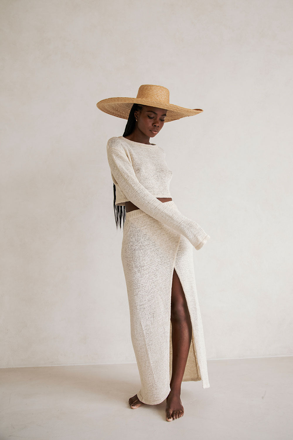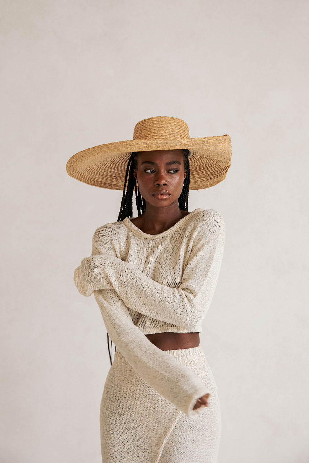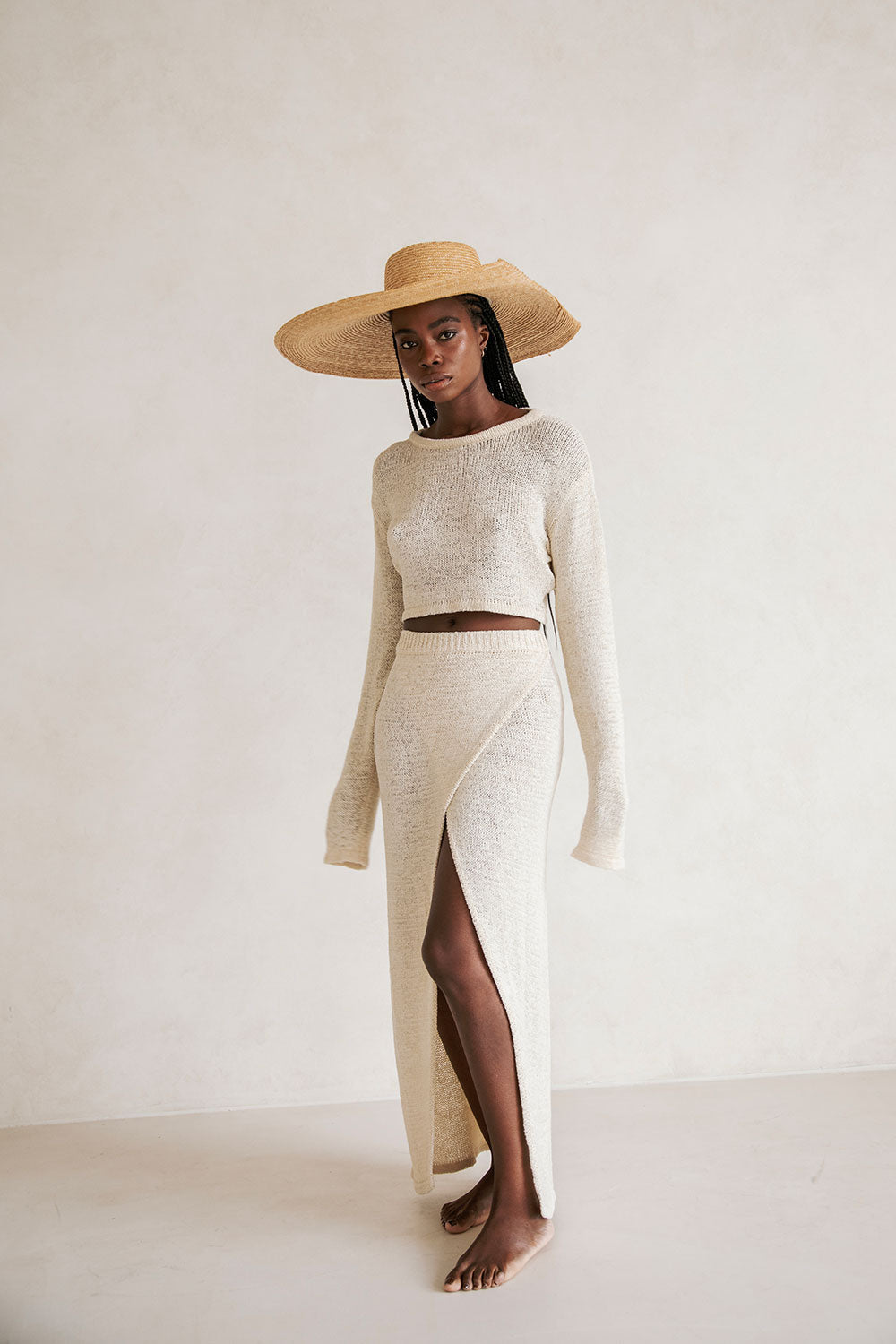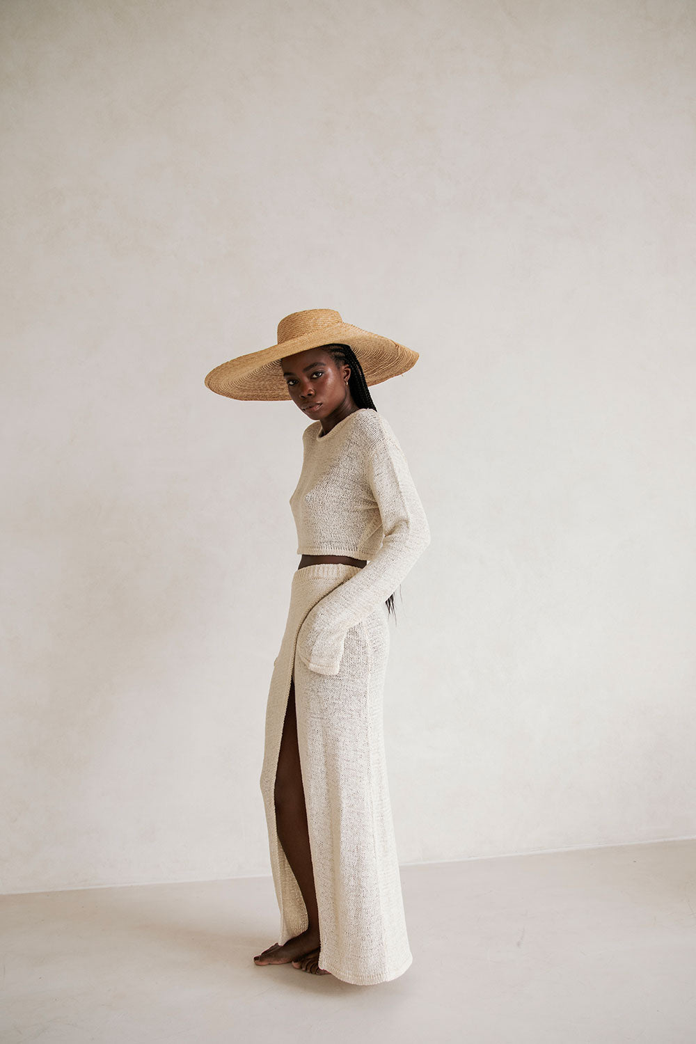 Wear it as a set or pair it back with jeans! The Harley Top is made from a soft loose knit in a creamy hue. It features knuckle length sleeves, ribbed trims, high neckline, relaxed fit and a cropped hem. Get the set and pair with the Harley Skirt! Designed exclusively by Sabo.