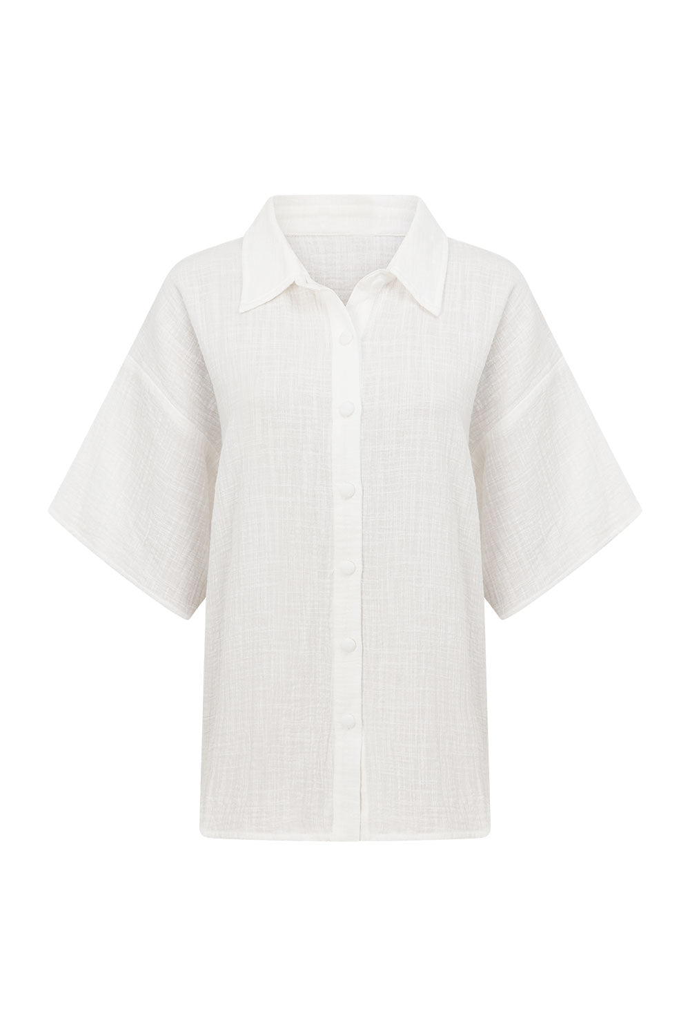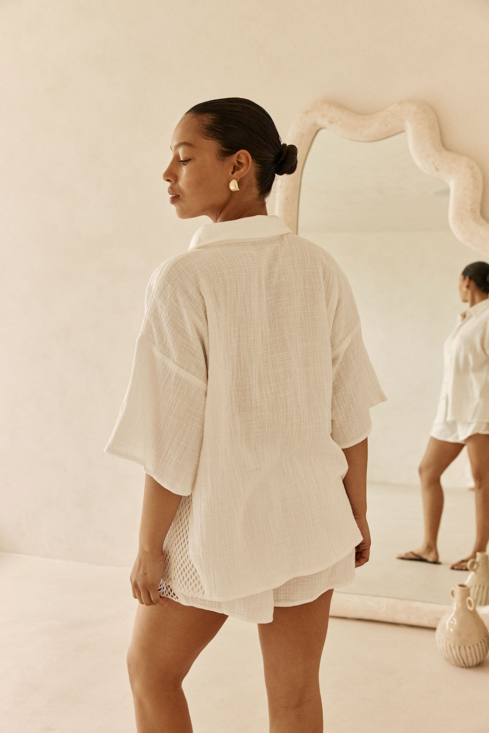 A simple, elevated go-to set, the Inara Top is made from a natural cotton fabric in white. It is a relaxed style featuring drop shoulders, short sleeves, collar and a functional covered button opening. Style your look with the Inara Shorts and and Kia Sandals! Designed exclusively by Sabo.