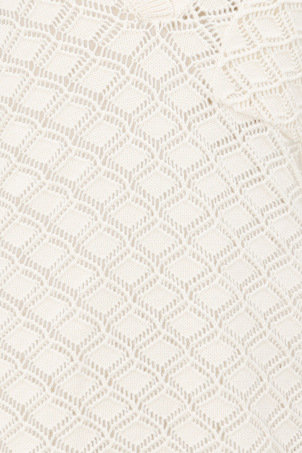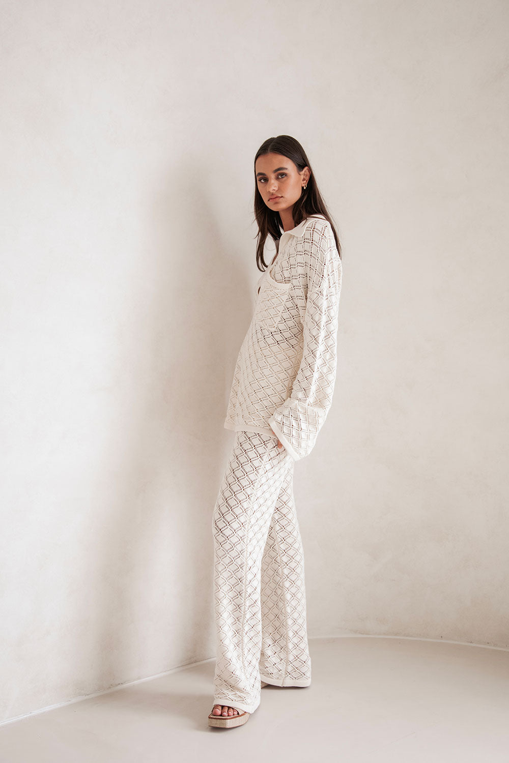 A cosy chic set that can be dressed up with heels or dressed down with slides! The Jaimie Top is made from a semi sheer natural cotton pointelle knit in a light cream hue. It features a collar with V neckline, drop shoulders with full length sleeves, single breast pocket, longline hem and contrast ribbed trims throughout. Layer with a bralette and pair with the Jaimie Pants! Designed exclusively by Sabo.