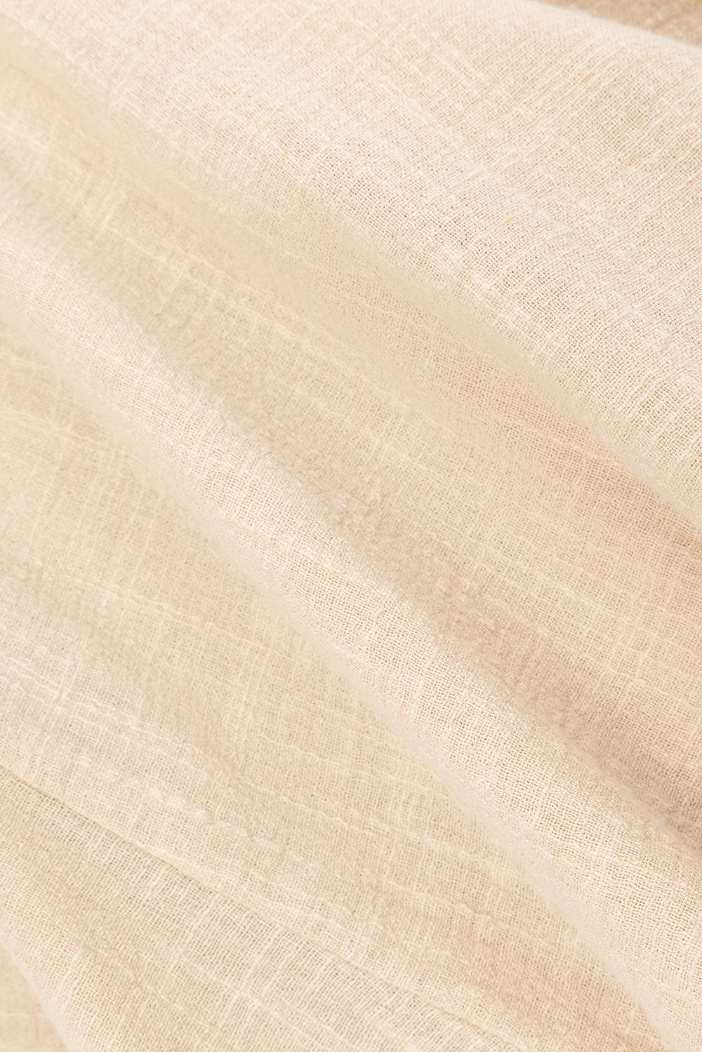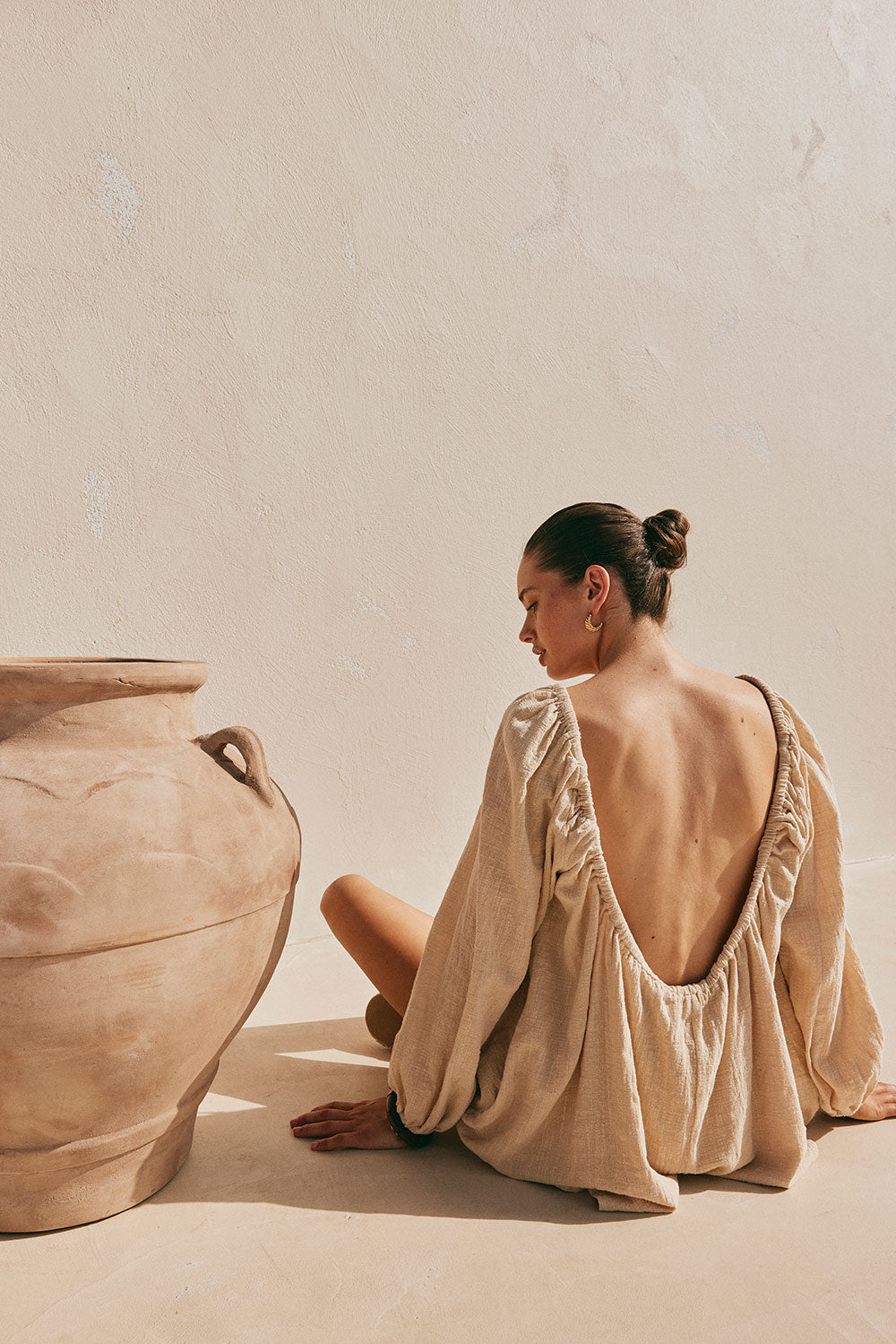 The outfit that is all about the back detail! The Jasmin Playsuit is made from a high quality natural cotton fabric in a tan hue. It is a relaxed style featuring a keyhole cutout at neck, adjustable tie neckline, low back detail, twin pockets and flouncy shorts. Style with sandals! Designed exclusively by Sabo.