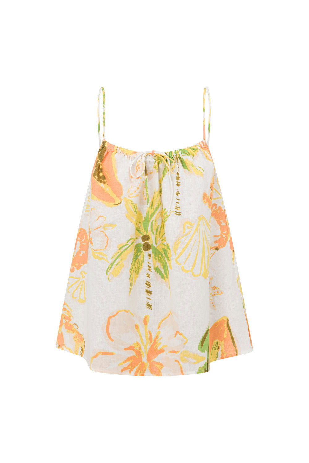 A super easy-to-wear shape from our Sundail collection! The Jetta Top is made from a structured linen cotton blend fabric with our exclusive seaview peachy print. It is a babydoll style featuring a drawstring neckline, tie at centre bust with adjustable rouleau straps and a relaxed fit and a-line hem. This style is bump friendly! Designed exclusively by Sabo.