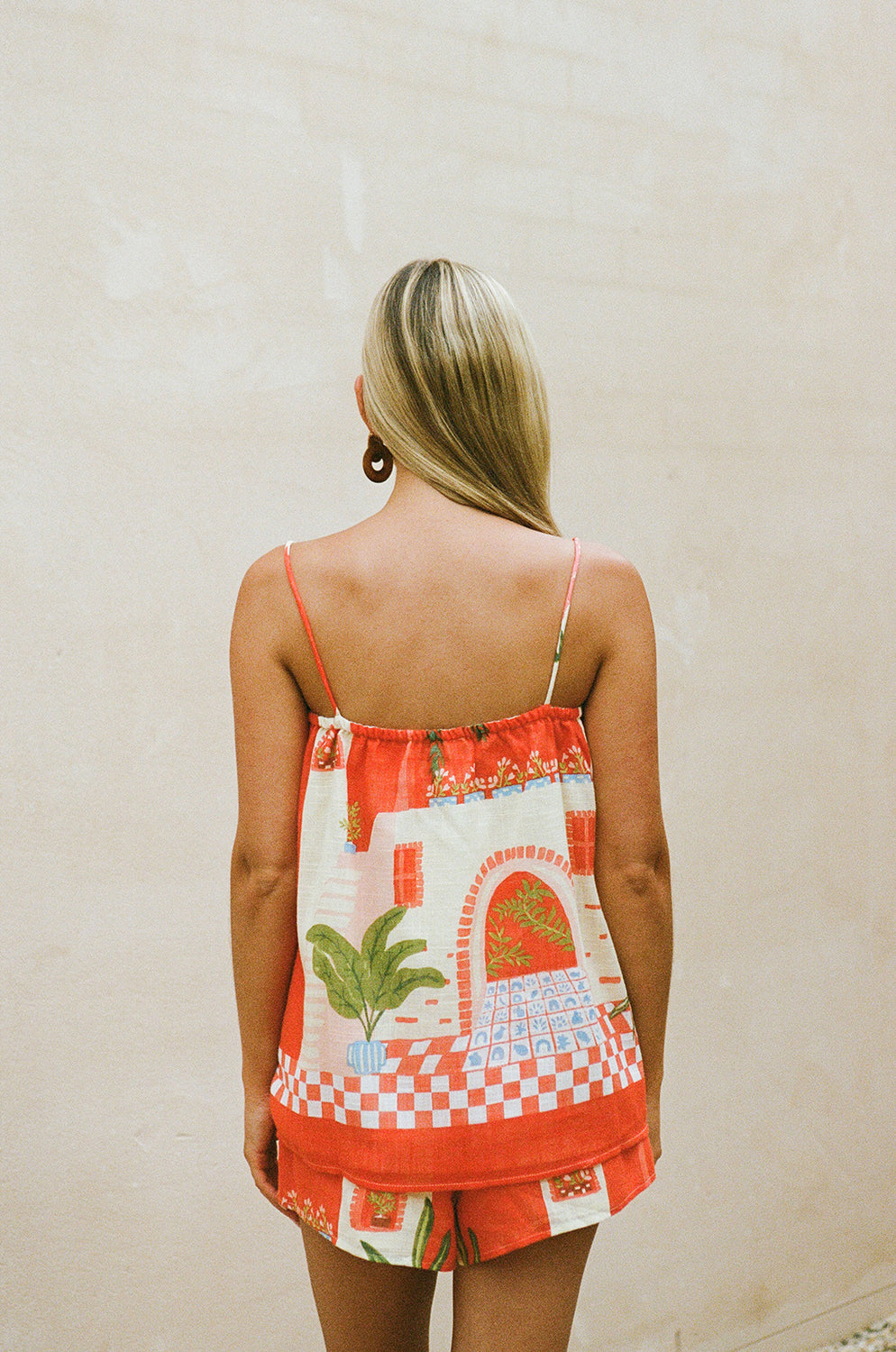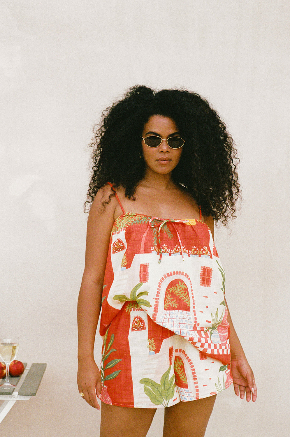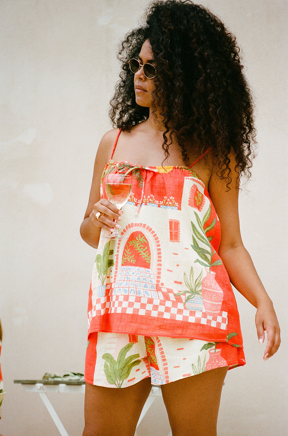 A super easy-to-wear shape from our Summer Haze collection! The Jetta Top is made from a high quality natural cotton cheesecloth fabric with our exclusive vista red print. It is a babydoll style featuring a drawstring neckline with rouleau tie detail with adjustable straps. This style is bump friendly! Designed exclusively by Sabo.
