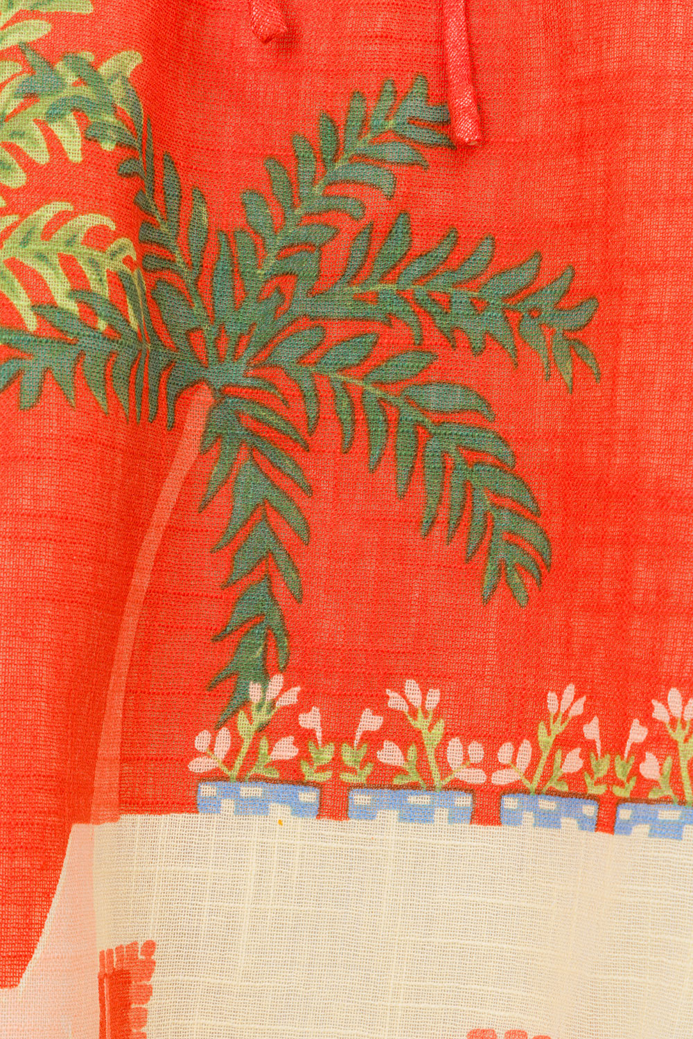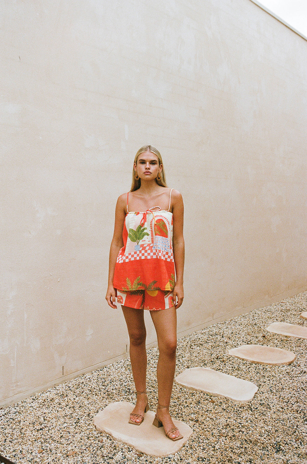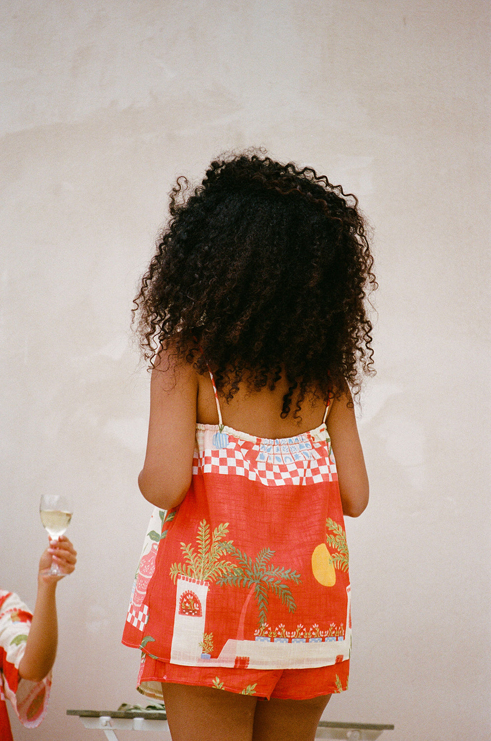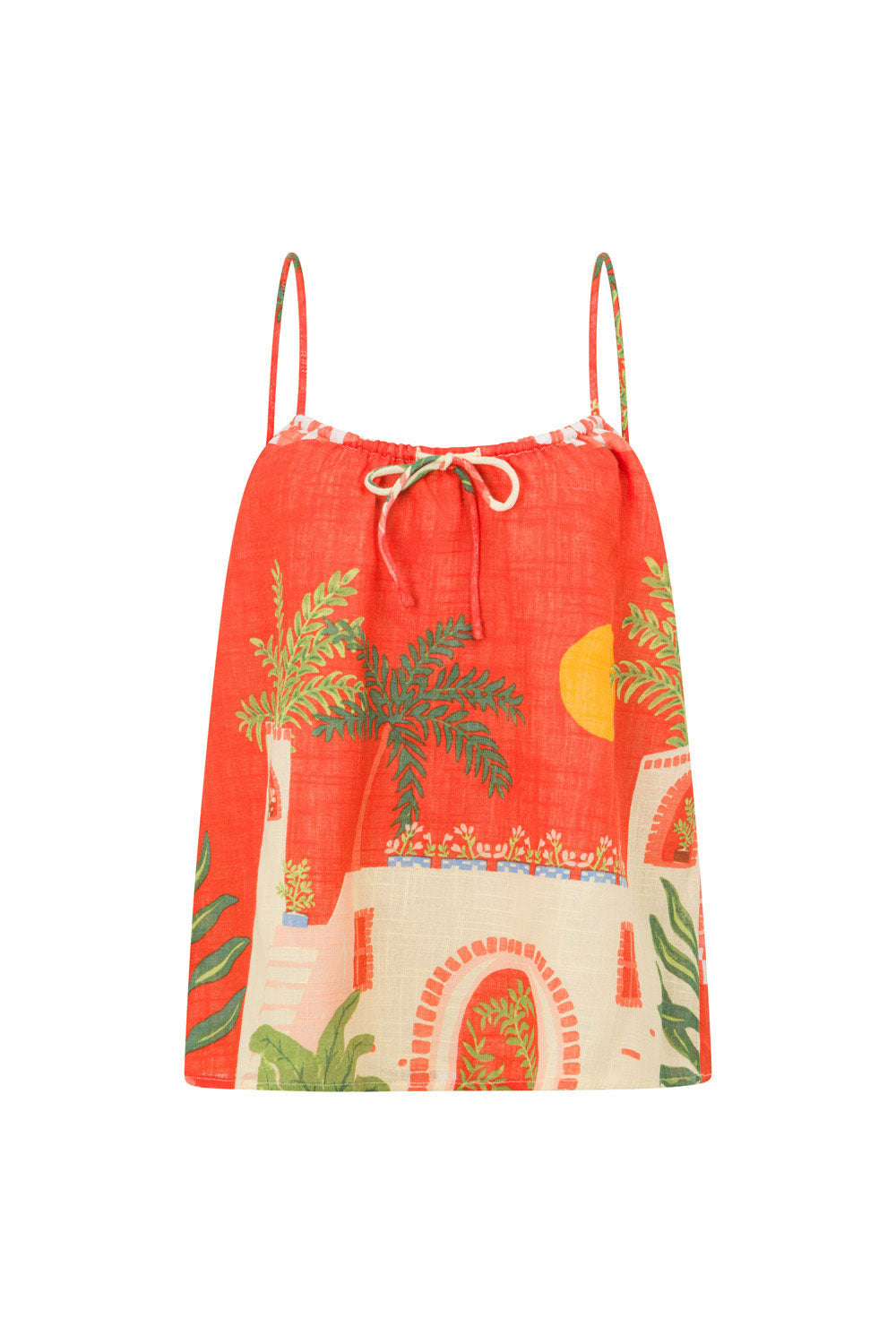 A super easy-to-wear shape from our Summer Haze collection! The Jetta Top is made from a high quality natural cotton cheesecloth fabric with our exclusive vista red print. It is a babydoll style featuring a drawstring neckline with rouleau tie detail with adjustable straps. This style is bump friendly! Designed exclusively by Sabo.