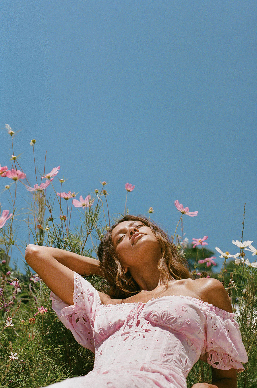 From our new SABO LUXE drop, the Jhene Dress is made from a high quality cotton broderie fabric with our exclusive pink smudge bloom print. It features short puff off shoulder sleeves with frill cuffs, ruffle trim across neckline, tie at centre bust, gathered cups, boning at waist for added structural support and a midi length skirt. Dress it up with heels for your next event! Designed exclusively by Sabo.