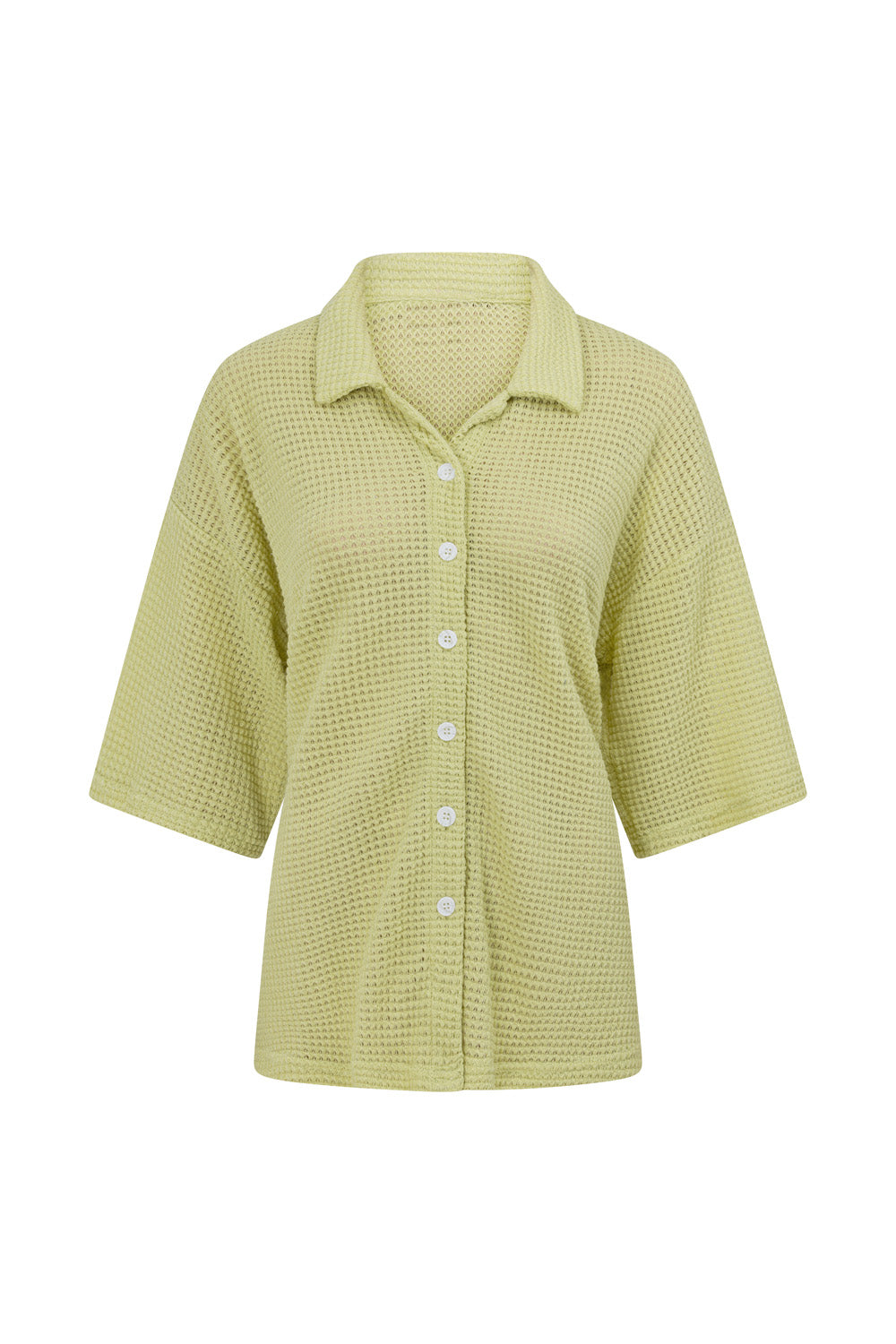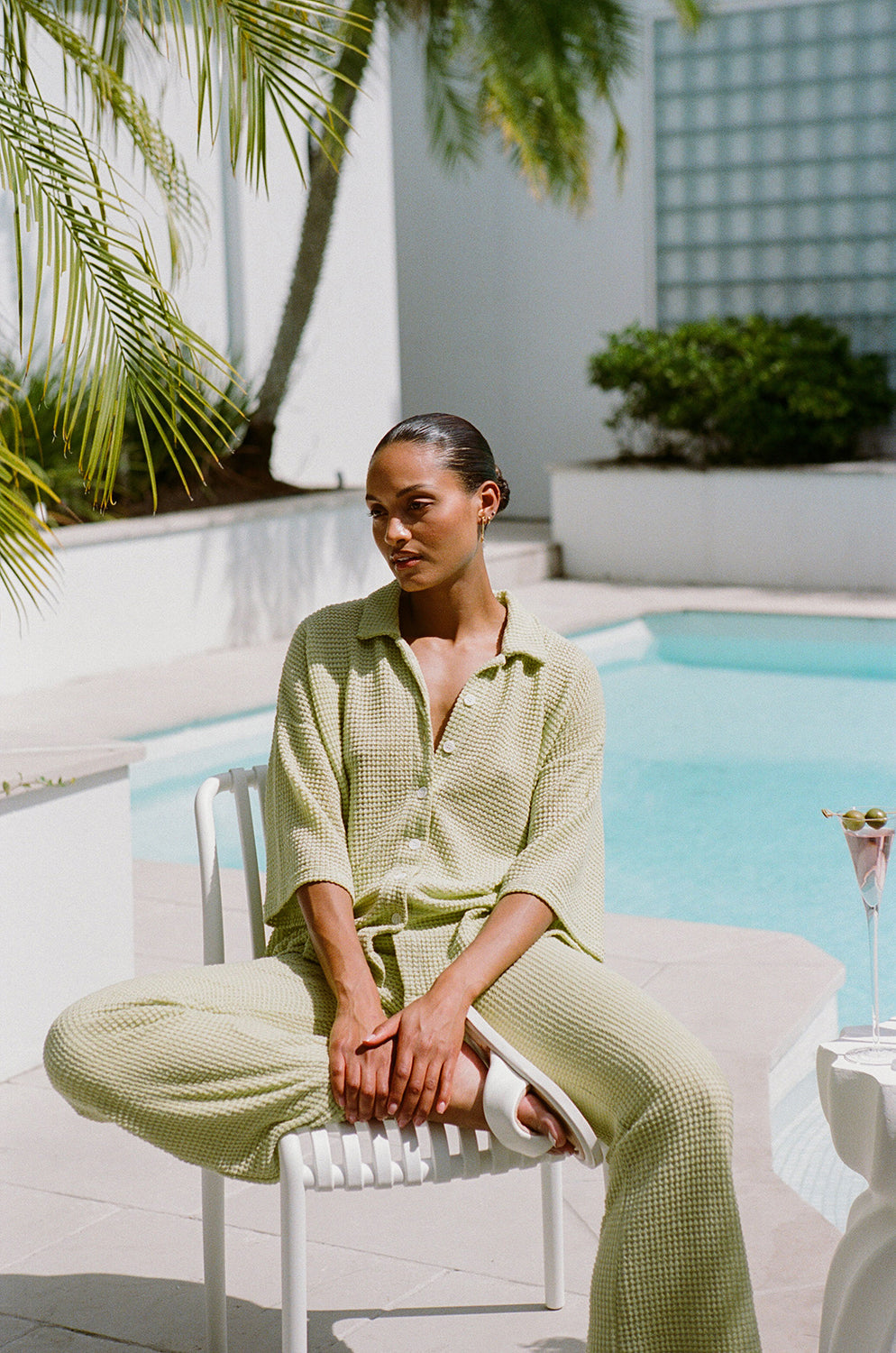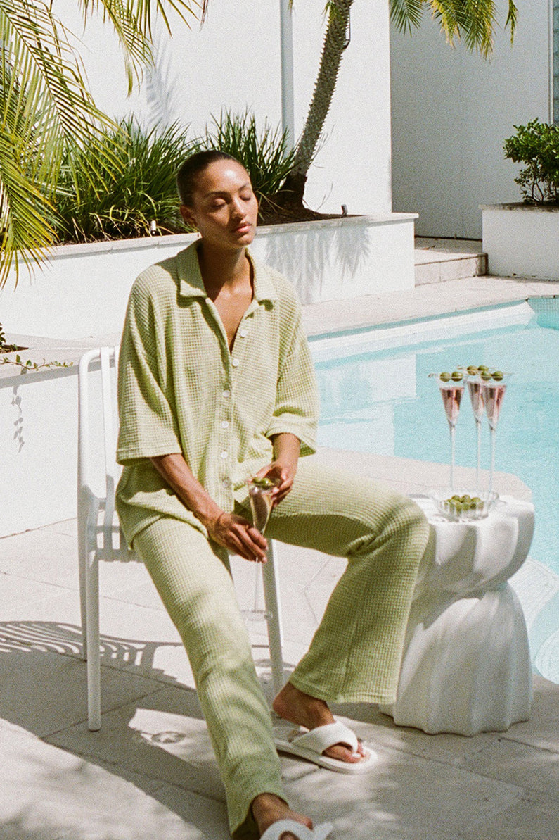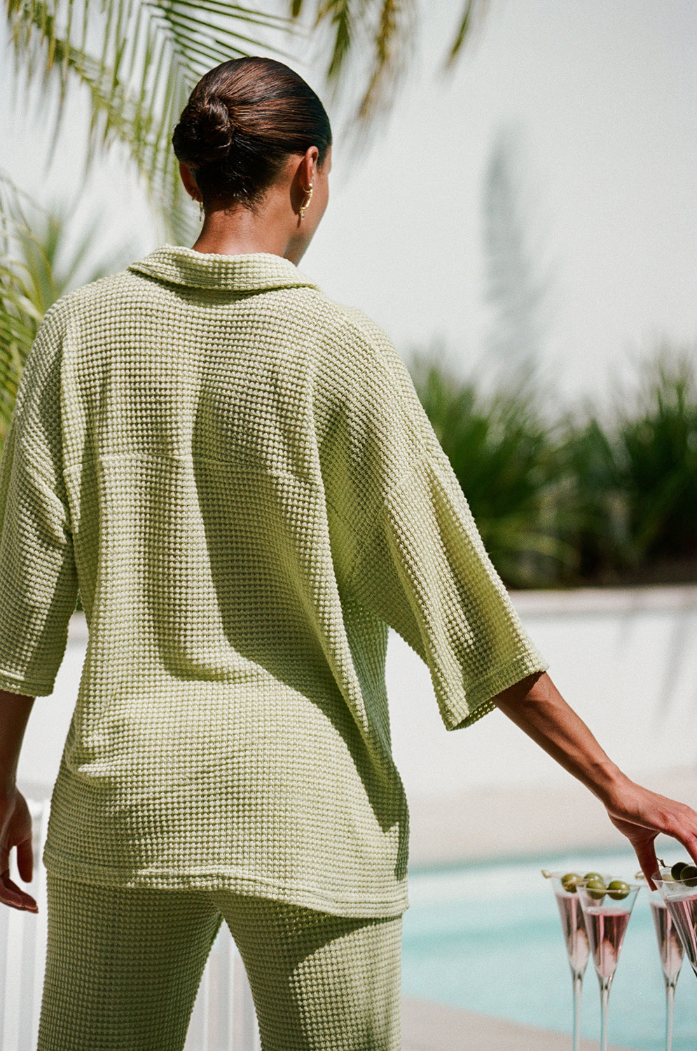 A staple set that is bound to be on high rotation! The Kai Top is made from a soft, lightweight woven fabric in a green hue. It is a relaxed style featuring drop shoulders, 1/2 length sleeves, collar and buttons down centre front. Complete the look with the Kai Pants and sandals. Designed exclusively by Sabo.