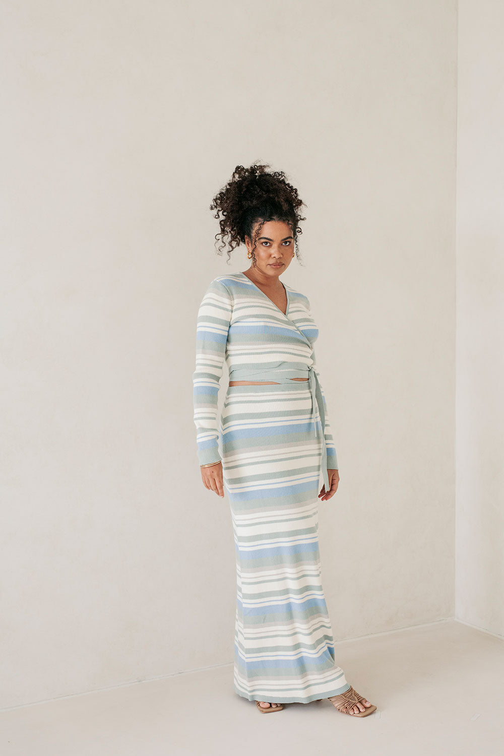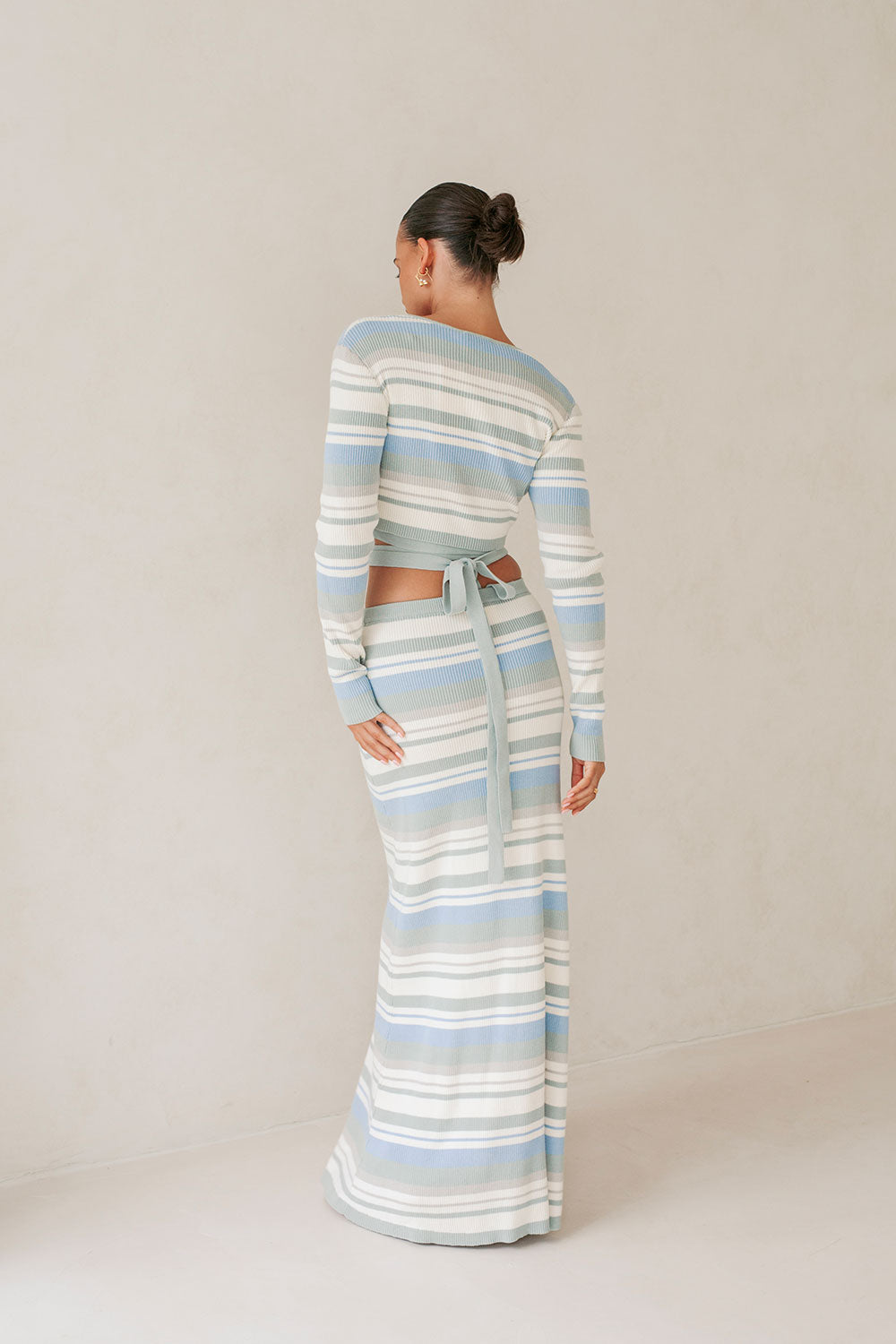 The perfect winter look has landed! The Kaila Skirt is made from a natural cotton knit with blue, dusty sage and white stripes. It is a high waisted style featuring an elasticated waist and maxi skirt with a wide hem. Get the set and pair with the Kaila Top and boots! Designed exclusively by Sabo.