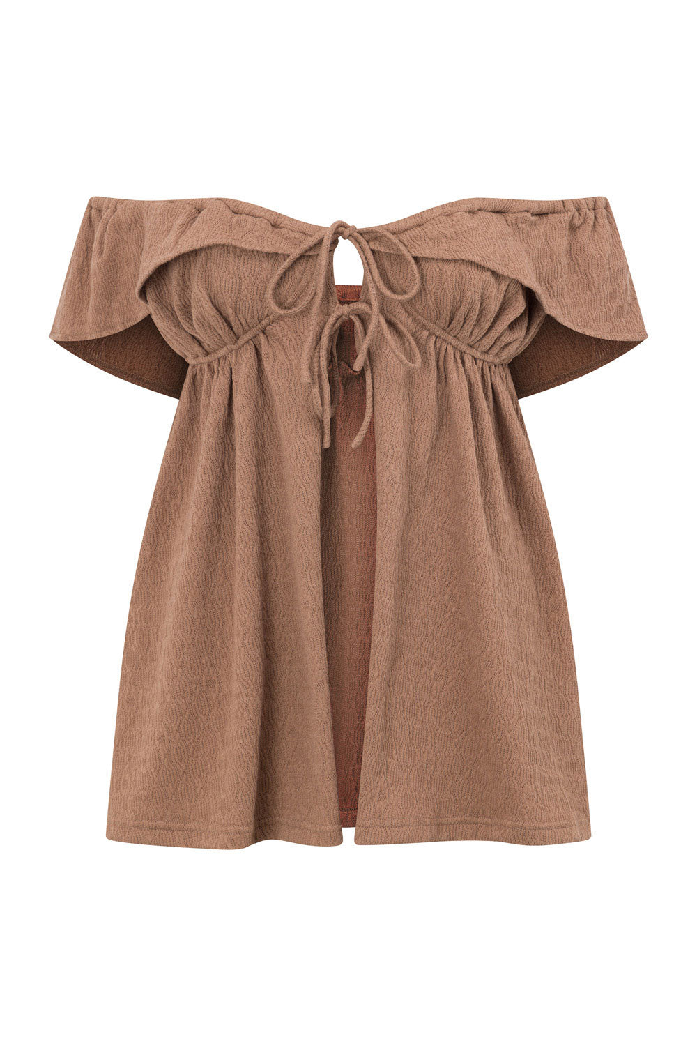 Take yourself to a sunset dinner in the Kala Top, made from a crinkle fabric in a chocolate brown hue. It is an off shoulder style featuring a frill across shoulders and a split at centre front with ties closures. Get the look with the Kala Pants! Designed exclusively by Sabo.