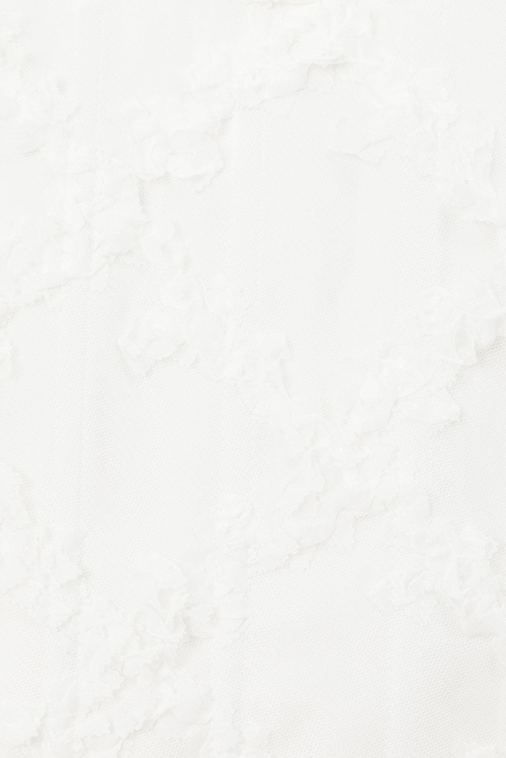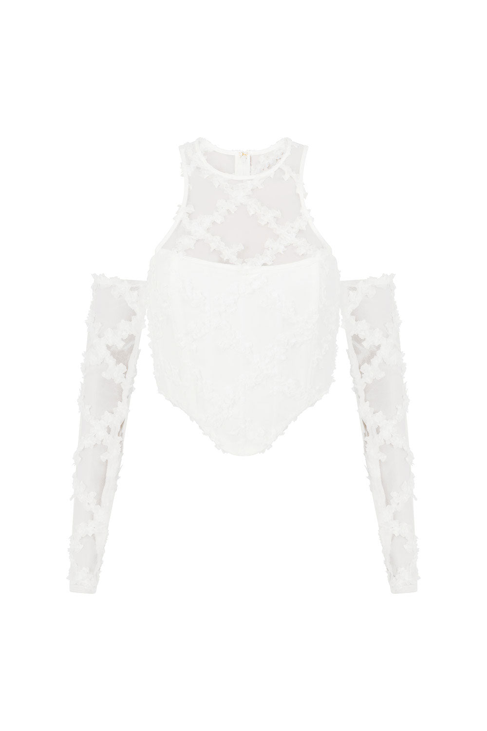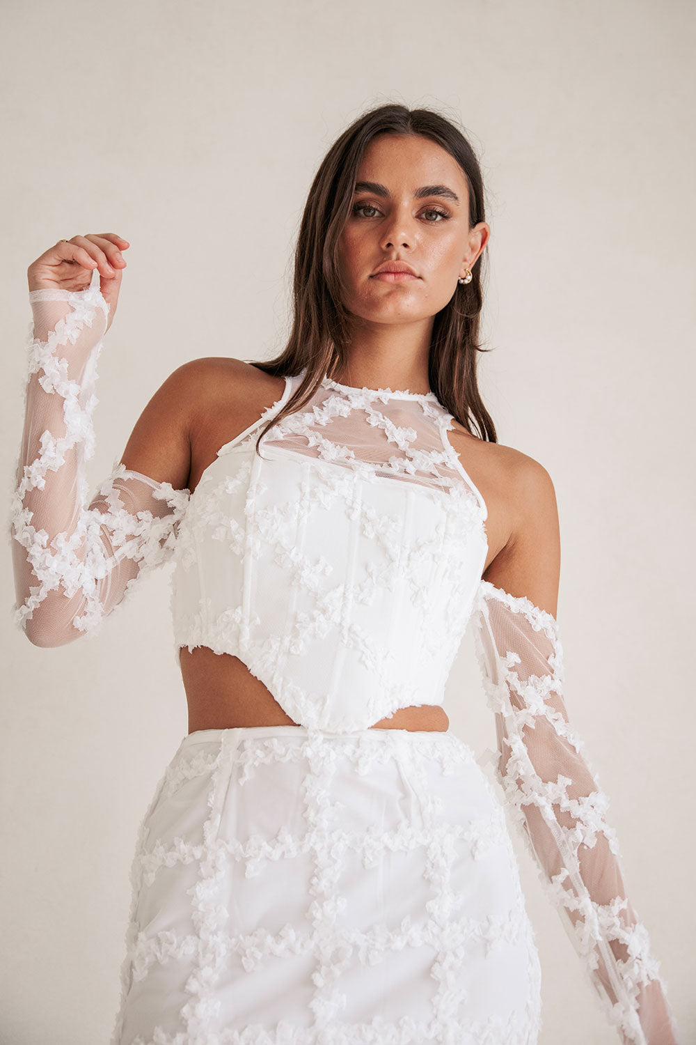 The perfect look for a special event, the Kaluha Top is made from our textured ruffle mesh fabric in white. It features sheer off shoulder sleeves and décolletage details and a structured boned bodice with curved hem. Get the look with the Dame Skirt and style with the Rosaria Heels! Designed exclusively by Sabo.