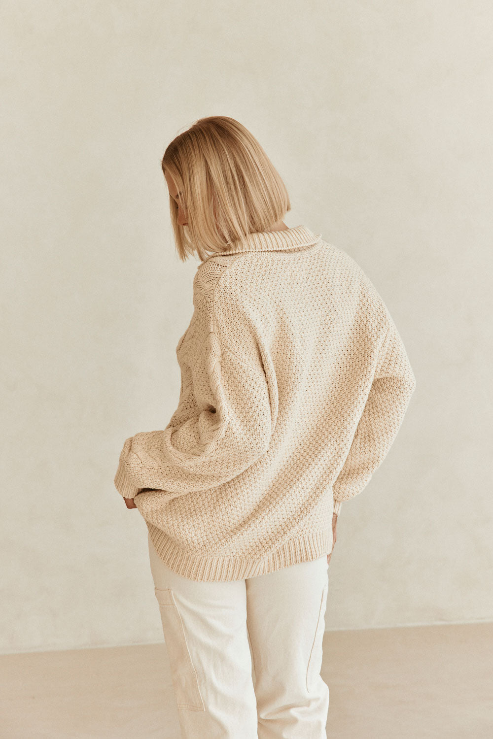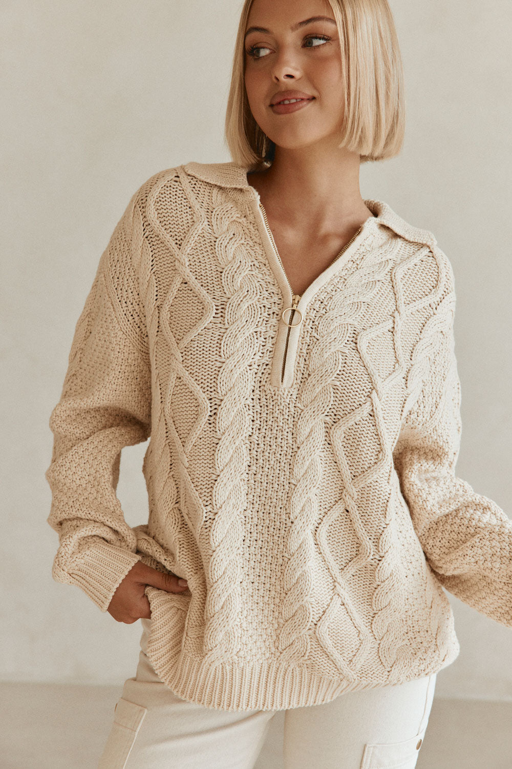 A timesless design to keep you cosy, the Karla Top is made from a soft natural cotton blend knit in a caramel hue. It is a boxy style featuring full length sleeves, ribbed cuff and trims, collar and zip opening and contrast cable knit design throughout. Designed exclusively by Sabo.