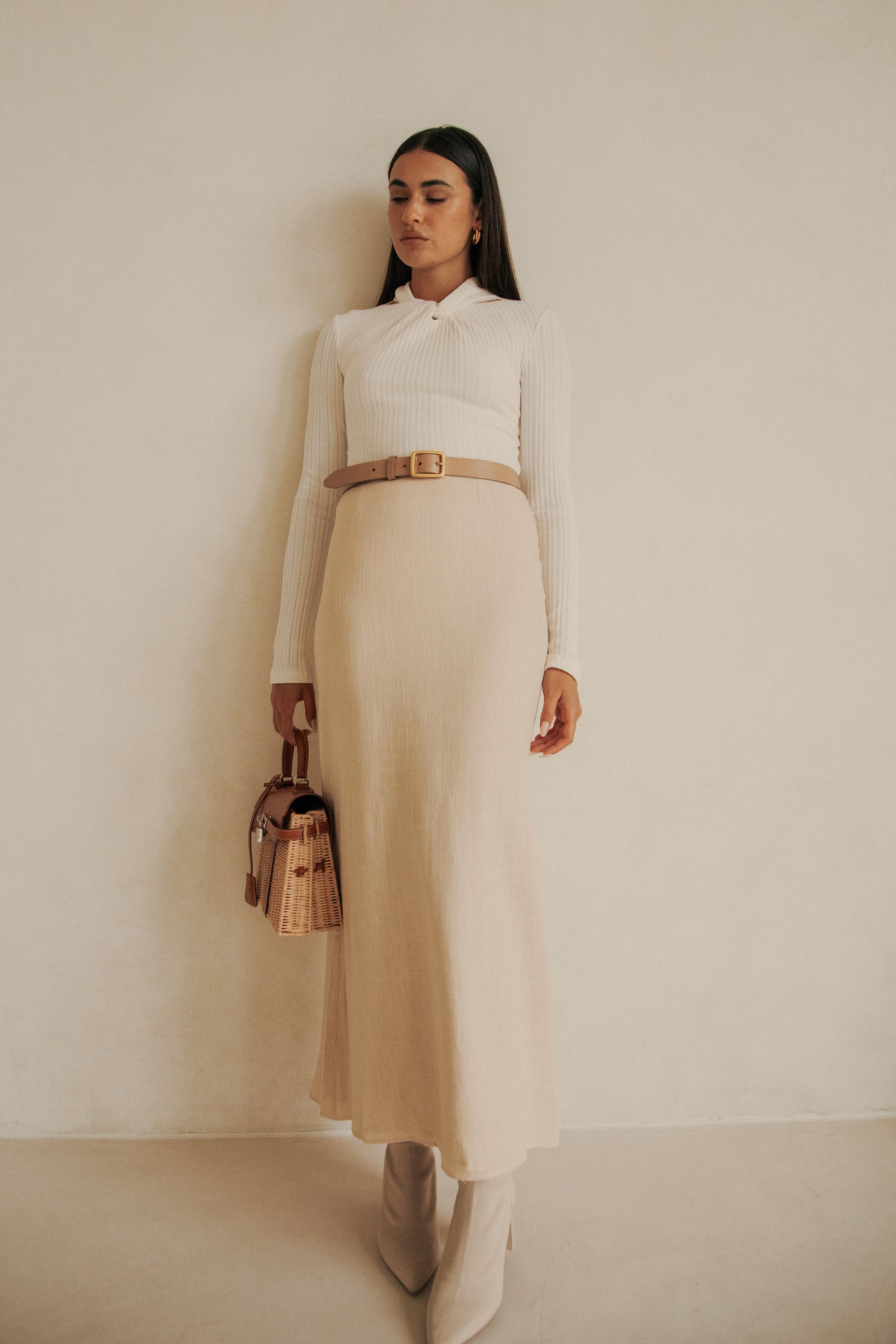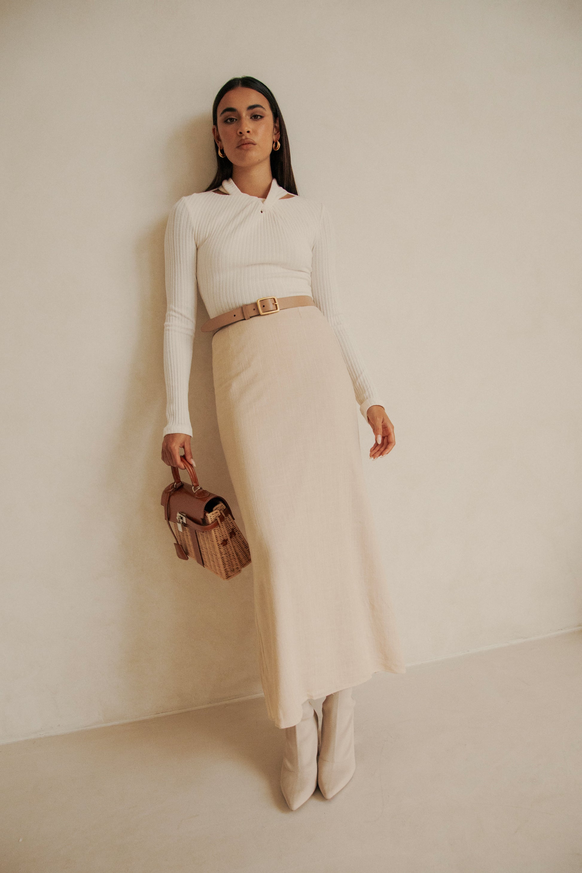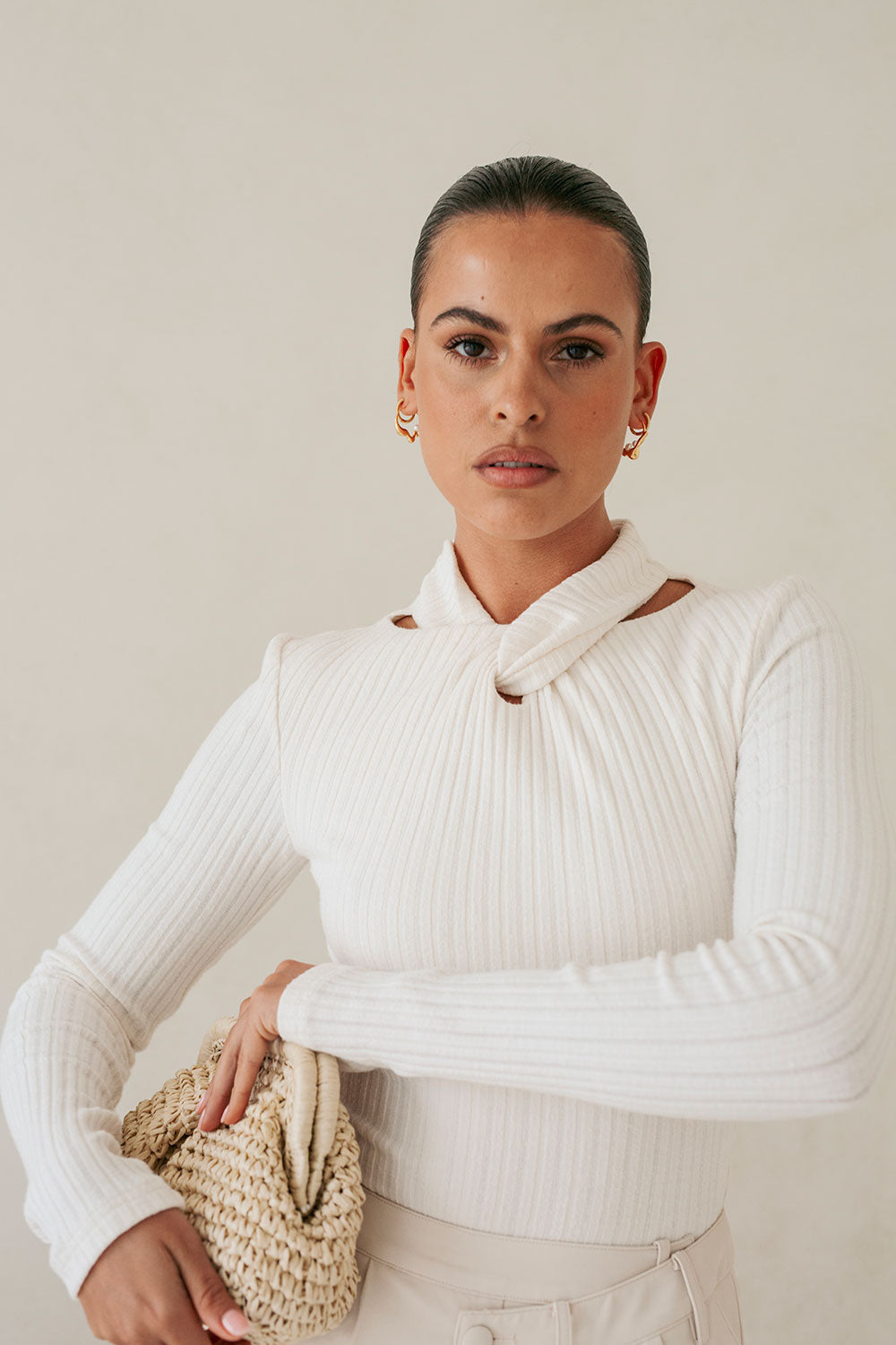 The perfect pair for your denim, the Kayla Bodysuit is made from a stretchy ribbed fabric in a light cream hue. It features full length sleeves, high neckline with cutouts and twist detail. Style with relaxed jeans! Designed exclusively by Sabo.