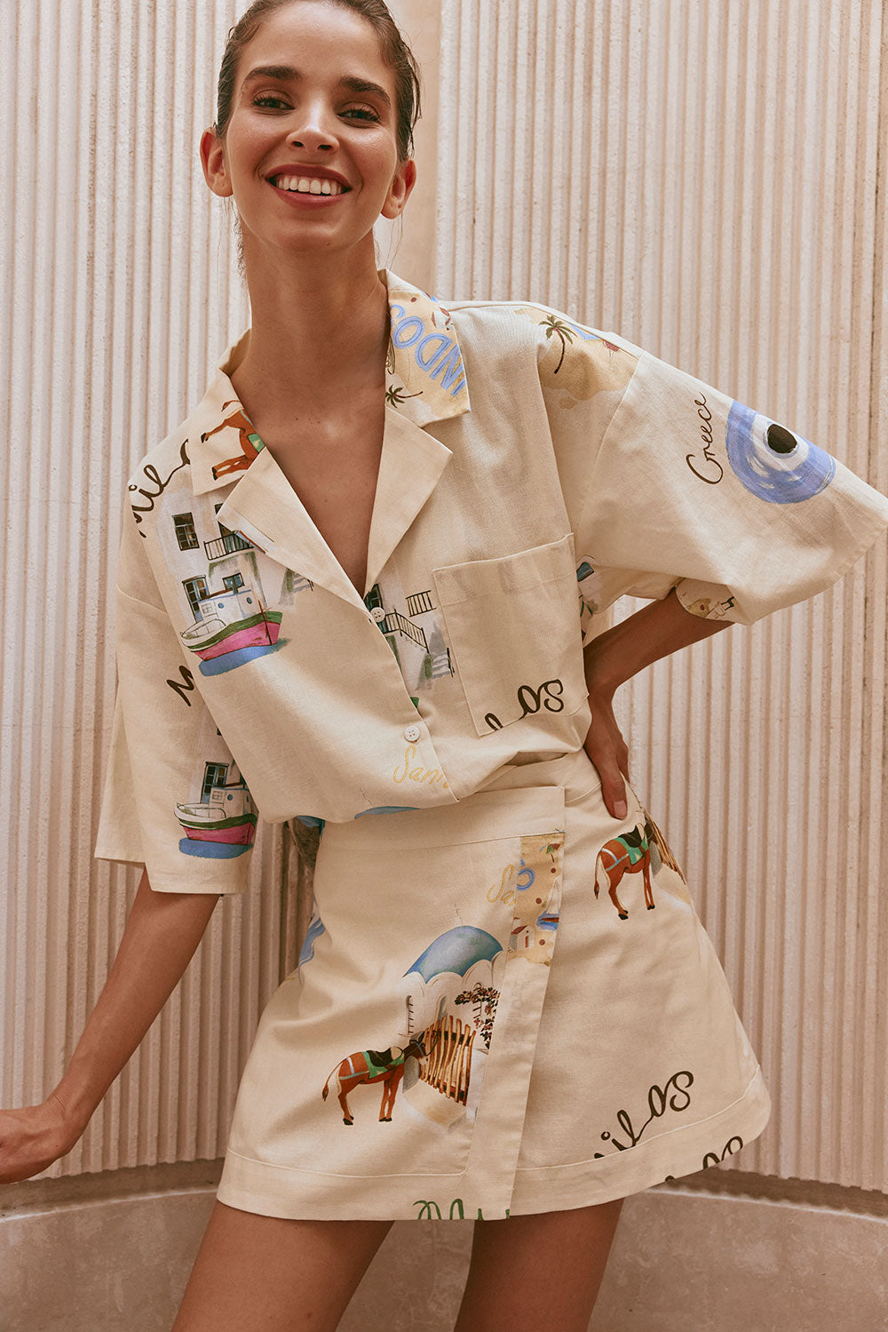 The vacation inspired Kea Skirt is made from a high quality linen cotton blend fabric with our exclusive Isles Of Greece print. It is a high waisted style featuring a fixed wrap panel at front and mini length hem. Pair with the Kea Top! Designed exclusively by Sabo.