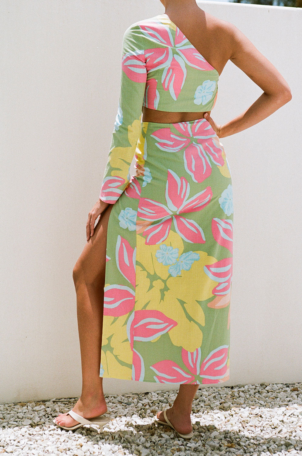Fitted and curved in all the right places! The Kelcie Top is made from a high quality cotton slub fabric with our exclusive calypso floral print. It features a one shoulder fitted sleeve and pointed scarf hem. Get the set with the Kelcie Midi Skirt! Designed exclusively by Sabo.